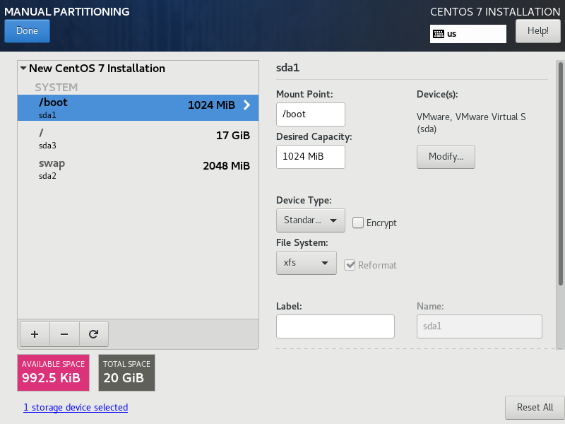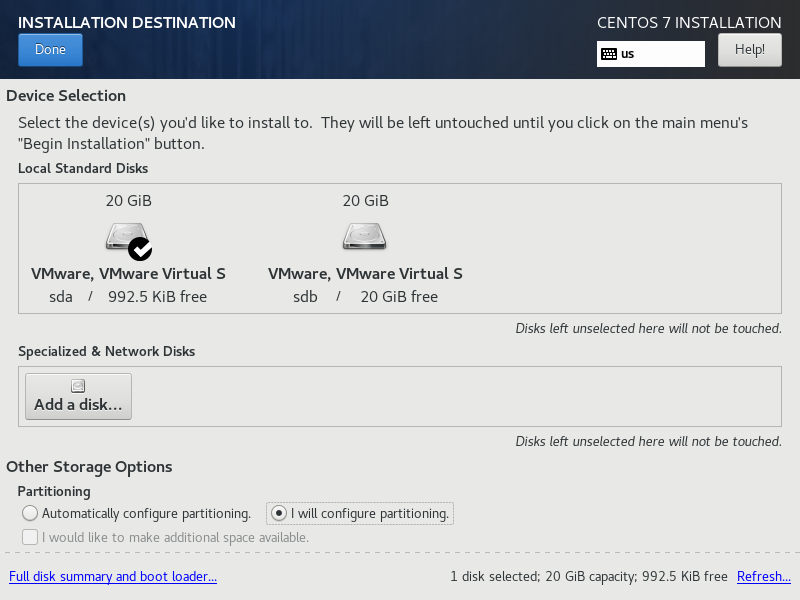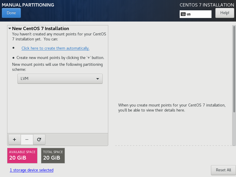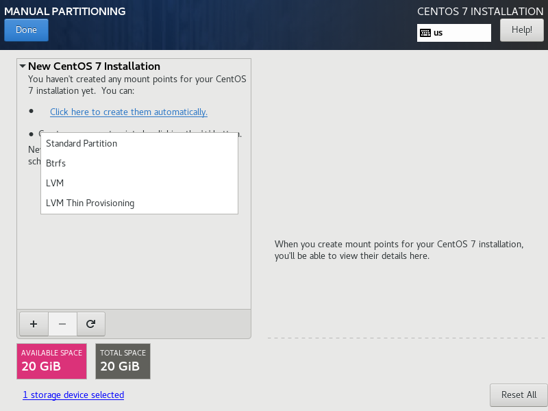 단순히 테스트나 스터디용으로 설치한다면 Automatically configure partitioning을 선택한 그대로 진행해도 되지만, 최소한 어떤 파티션이 얼마만큼의 용량을 가지고 설정되는지 정도는 알아야 하니 I will configure partitioning을 선택하고 Done 버튼을 클릭한다.