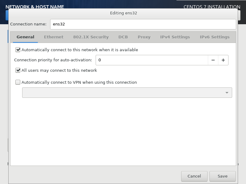 General 탭에서는 Automatically connect to this network when it is available을 체크하여 CentOS 부팅 시 해당 네트워크 인터페이스가 자동으로 활성화되도록 한다.