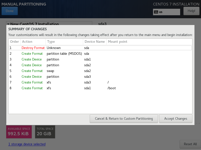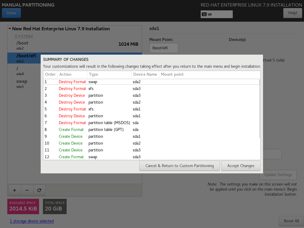 파티션 생성과 수정이 완료되었다면 Done 버튼을 클릭하고, Accept Changes 버튼을 클릭하여 적용한다.