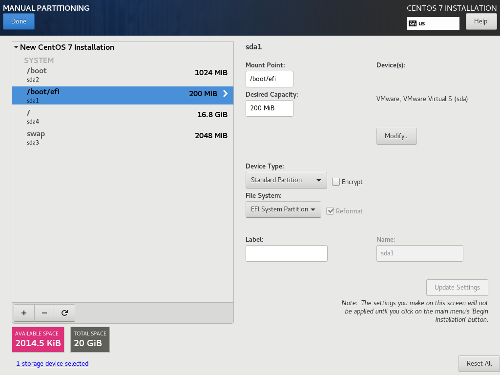 UEFI BIOS에서는 200MiB 크기의 /boot/efi 파티션이 하나 더 추가된다.