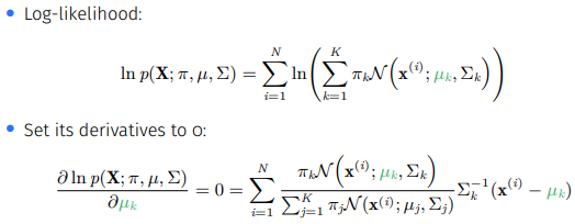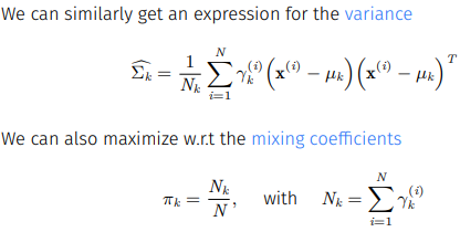 M-step: log likelihood를 최대화 하도록 Gaussian의 parameters를 update한다.(데이터는 E-step에서 계산한 분포에서 생성되었다고 가정, 새로운 분포 추가 x)