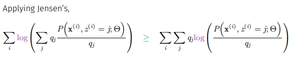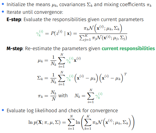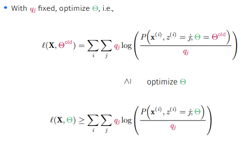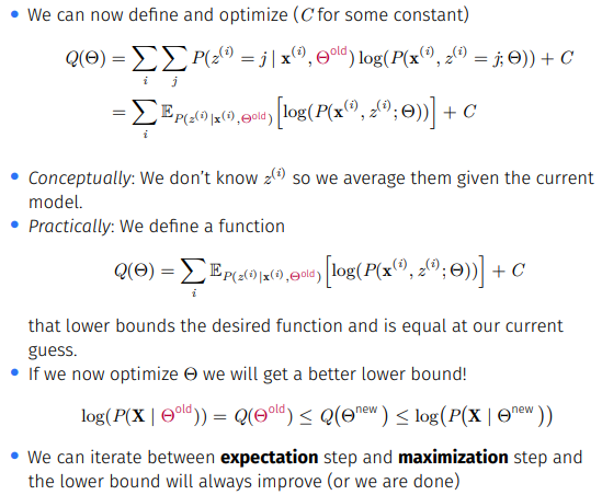 GMM은 관측되지 않은 잠재 변수를 포함하여 로그 우도 함수를 직접 최대화하는 것이 어렵다. 따라서 간접적인 방법으로 최대화하기 위해 로그 우도 함수의 기댓값인 를 정의하고 이를 로그 우도 함수의 하한값으로 생각해 하한값을 개선하는 방향으로 로그 우도 함수를 최대화 한다. EM 알고리즘은 E-step과 M-step으로 이루어져 있어 하한값을 계산하는 단계, 하한값을 개선하는 단계로 나뉜다.
