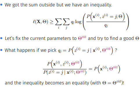 그럼 왜 E-step이 expectation step이라 불리냐면 실제 EM algorithm은 위에선 정의한 , 로그 우도 함수의 기댓값을 E-step에서 계산하기 때문이다. E-step에서 와 사후 확률(z의 분포를 모르기 때문)로 를 계산하고 M-step에서 를 최대화 하는 새로운 를 찾아 로그 우도 함수의 하한을 개선한다. 이 때, 는 실제 로그 우도의 를 대입했을 때와 같고 를 최대화하면서 log likelihood를 최대화 하기 때문에 간접적으로 최대화한다고 한다.
