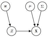 우리는 GMM을 simplify하기 위해 hidden varible인 를 도입할 것인데 는 위에서 소개한 missing coefficients를 확률로 가지면서 관측값 가 어떤 가우시안에서 생성되었는지를 나타낸다.