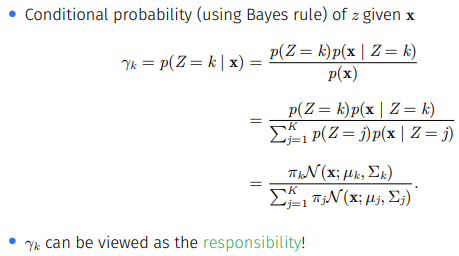 1. E-step: 각 Gaussian이 data point에 대해 만들어 내는 posterior probability를 계산한다.(현재 매개변수 추정치를 기반으로 각 데이터 포인트가 특정 클러스터에 속할 조건부 확률을 계산)(k가 clusters중 하나를 의미)