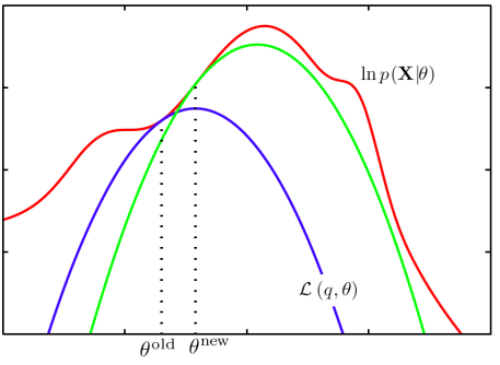 이렇게 되어 q가 고정되어 있는 파란색 likelihood에서 로 개선이 되고 그 값에서 새로운 q에 대한 likelihood funtion의 하한을 찾게 된다. 즉, E-step에선 우도 함수의 하한선을 계산하고 M-step에서 그 하한선을 최대화하는 새로운 매개변수 값을 찾게 되며 이 과정을 반복한다.