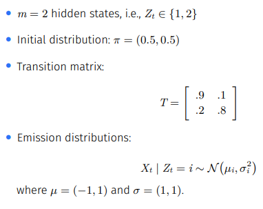 m=2라는 것은 Z가 2개의 states를 가질 수 있고 나머지 initial distribution, transition matrix, emission distributions가 정의된다.