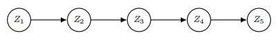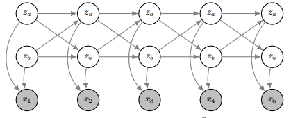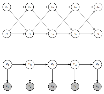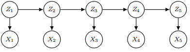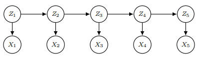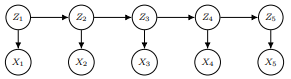 hidden Markov model(줄여서 HMM)은 위 유향 그래프를 나타내는 모델이다. Z들은 hidden states를 의미하고 X들은 sequence of observations로 우리에게 관찰되는 값들이다. 확률 분포로 표현하면