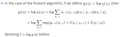 Viterbi algorithm의 경우 log로 통해 이 문제를 해결하였지만 forward와 backward의 경우 조금 더 복잡한데 왜냐하면 log안에 합이 존재하기 때문이다.(합의 로그와 로그의 합은 다르다!)