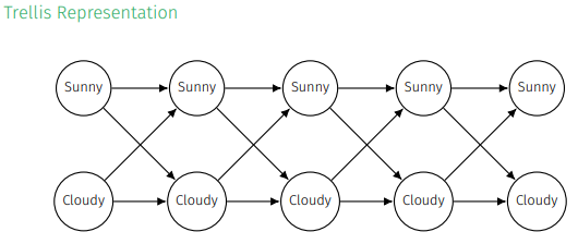 마치 격차처럼 Trellis Representation을 할 수 있고 여기서의 path는 joint assignment(특정 시점에서 변수들의 동시 할당, 위 상황에서 path sunny-cloudy-sunny-sunny-cloudy는 각 요일의 날씨가 sunny, cloudy, sunny, sunny, cloudy를 의미)를 나타냄.