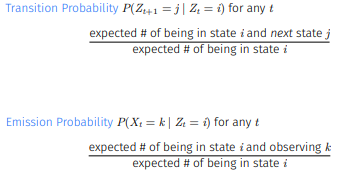 또한 Z에서 다음 Z로 넘어가는 transition probabilites와 Z에서 X로 넘어가는 emission distributions이 있는데 이 값들은 모두 time-homogeneity해 시간에 의존하지 않는다.