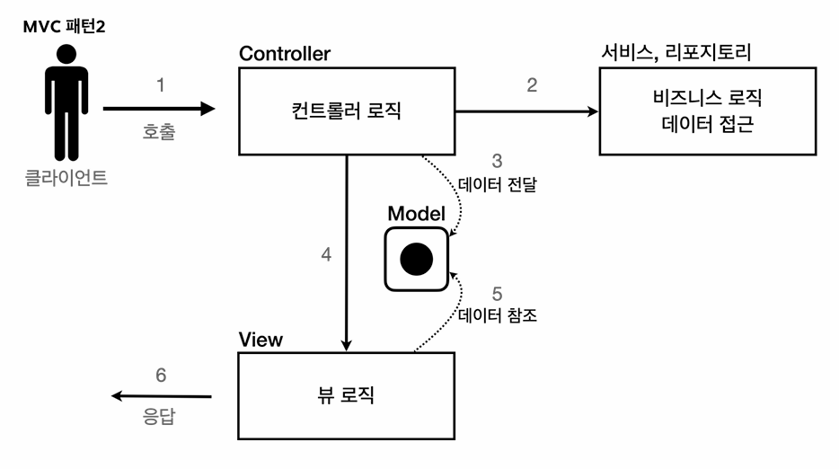 - ์์ ๊ฐ์ ๊ทธ๋ฆผ์ด ์ฐ๋ฆฌ๊ฐ MVC๋ชจ๋ธ์ด๋ผ๊ณ ์๊ฐํ๋ ๊ทธ๋ฆผ