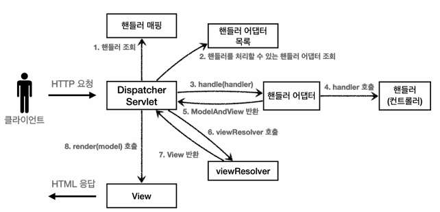 5. ModelAndView 반환 : 핸들러 어댑터는 핸들러가 반환하는 정보를 ModelAndView로 변환해서 반환한다.