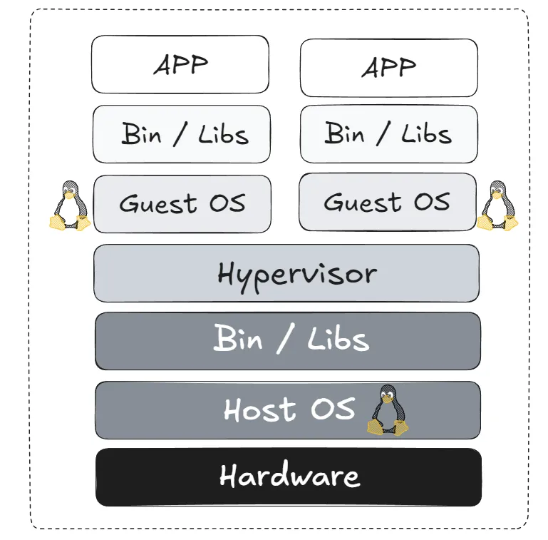 - 하이퍼바이저를 통해 물리적 서버 위에 여러 가상 머신을 생성