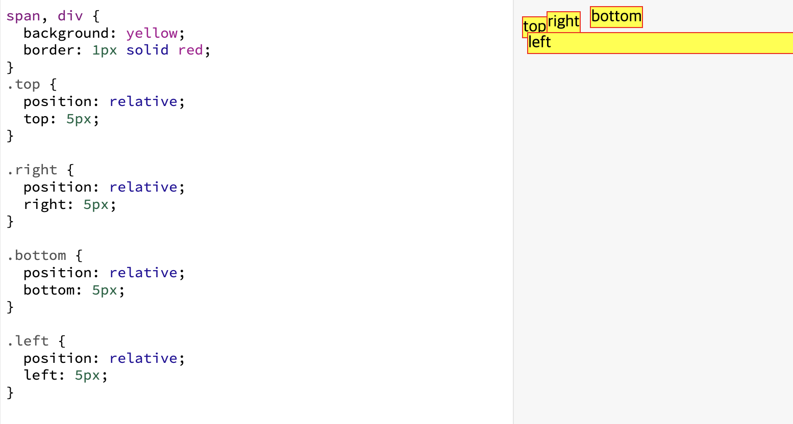 위에서 주의해야할점은 예시를 보면 알수있듯이 top: 5px를 주면 아래로, bottom: 5px를 주면 위로 이동한다는 점이다. 바깥쪽으로 이동하고 싶다면 음수(negative number)를 적용하면 가능하다. 또한 position relative 는 position absoulte의 조상의 역활도 한다.