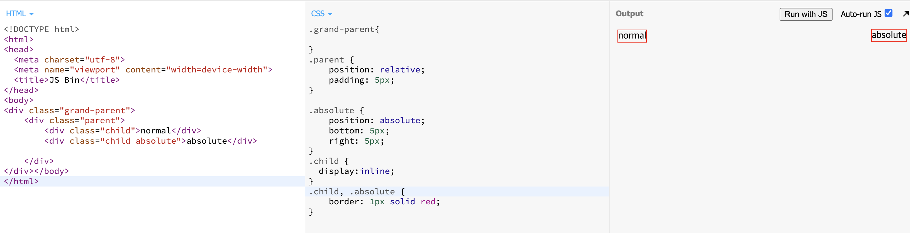 output에서 확인할수있듯, class child absolute는 조상인 parent를 기준으로 움직인것을 확인할수있다.