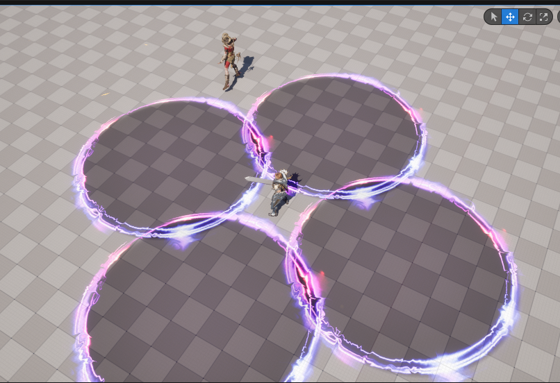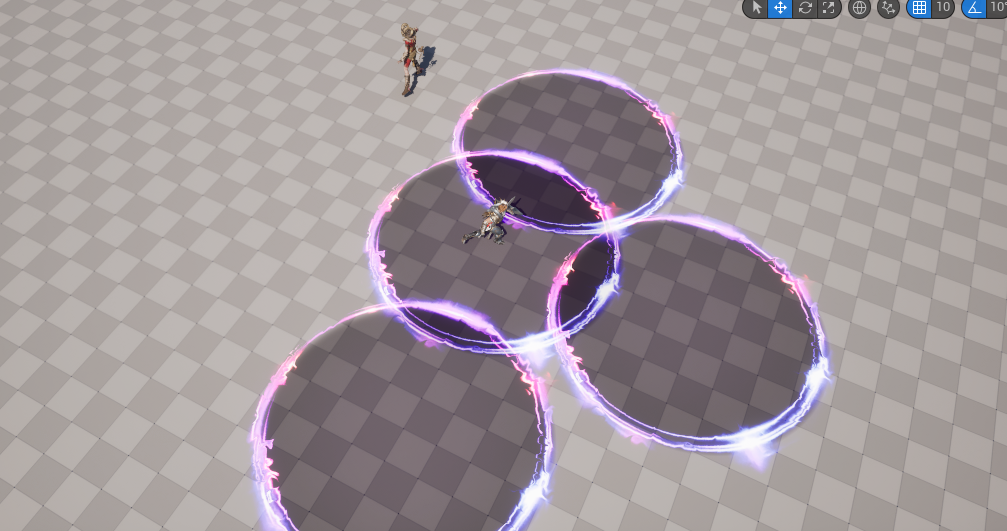플레이어가 이동하고 있는 방향을 기준으로 정면쪽에 생성된 모습이다. 7시 방향의 장판은 다른 것보다 더 떨어져있는 걸 볼 수 있다.