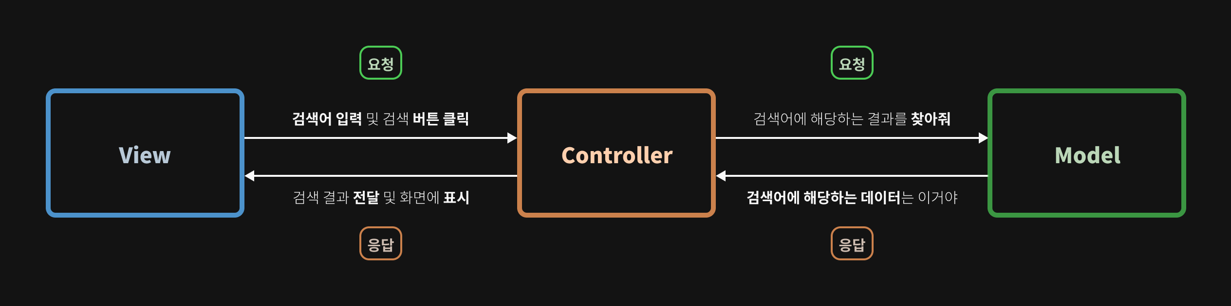 - ex. 사용자가 입력한 검색어를 Model에 전달하고, 처리 결과를 View에 넘김