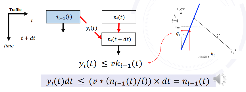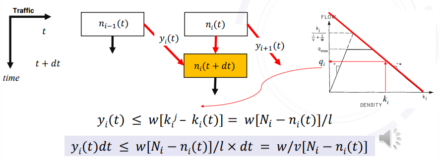 t시간 간격동안 다음 셀로 이동한 차량의 수 <= 셀 i에서의 최대 수용 가능 차량 수 - 시간 t에서 셀 i의 실제 차량 수 * (w/l dt: 자유속도 / 셀의 길이(l = v x dt) -> w/v(평균속도))