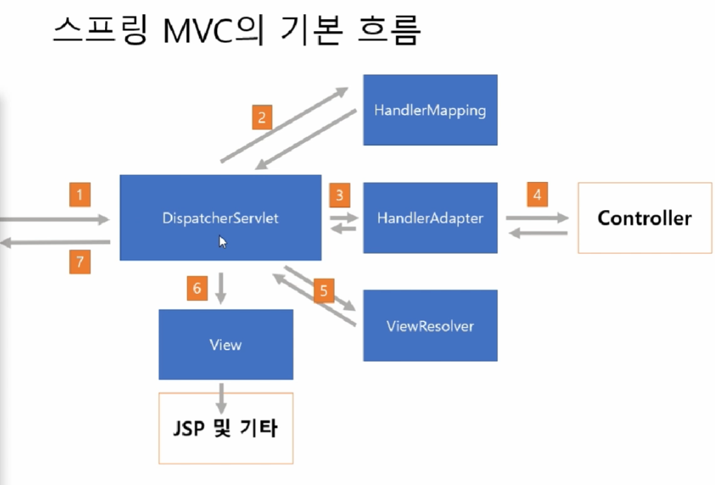 그림의 파란색 부분은 스프링이 처리해줌, 개발자는 'Controller'와 'jsp및 기타'만 작성해주면 된다.