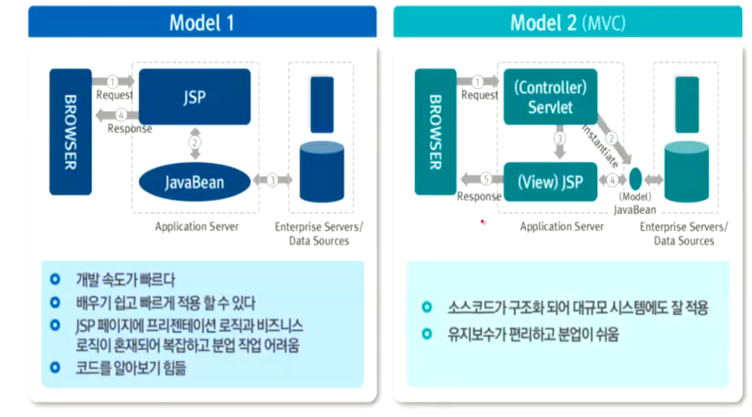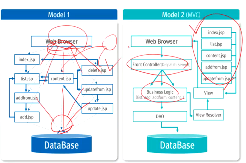 model1과 model2의 제일 특징적인 부분은 model1같은 경우 각각의 jsp에서 모든 비지니스로직과 화면단을 처리한다는 하기때문에 클라이언트 접근도 각각 jsp에 접근을 하고 데이터베이스도 각각 접근을 하기 때문에 코드의 중복이 많음.