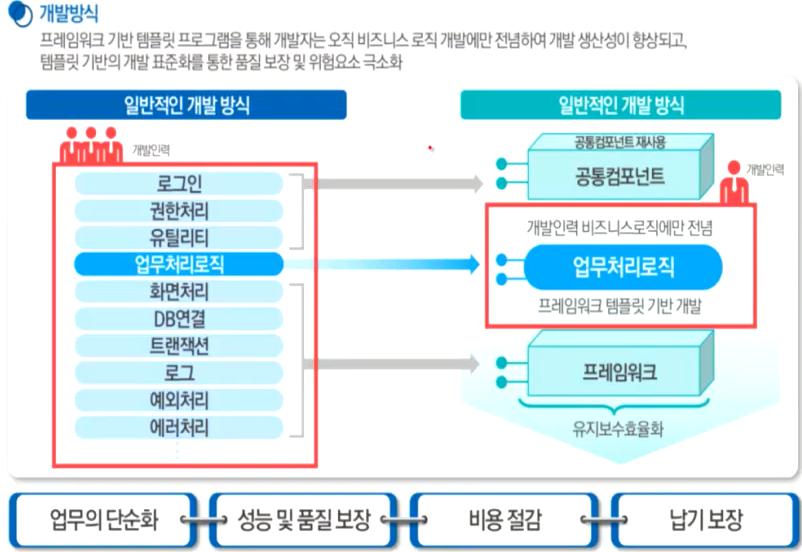 이전에는 일일히 개발자가 기능마다 코딩을 했다면 전자정부 표준프레임워크는 필요한 컨포넌트를 가져다가 조립하는 형태로 필요한 업무처리조직만 개발자가 집중적으로 코딩할수 있어 비용절감 효과가 있다.