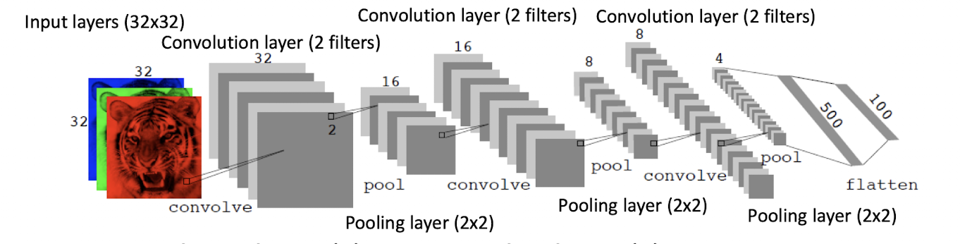 ์ผ๋ฐ์ ์ธ `CNN`์ ์ฌ๋ฌ ๊ฐ์ `ํฉ์ฑ๊ณฑ ์ธต`(convolution layers) ๊ณผ `ํ๋ง ์ธต`(pooling layers) ์ผ๋ก ๊ตฌ์ฑ๋จ