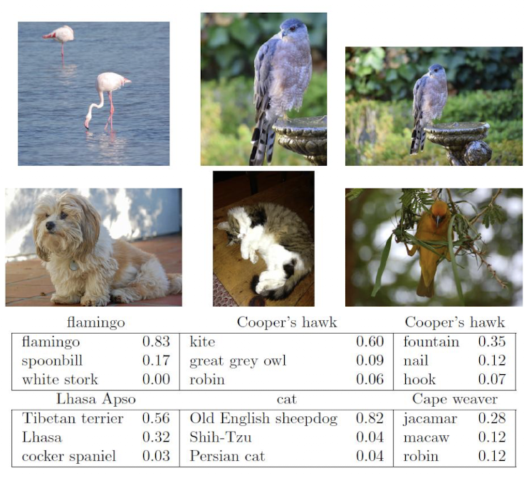 ์ด ํ๋ฅ ๊ฐ์ ํด๋น ์ด๋ฏธ์ง๊ฐ ๊ฐ ํด๋์ค์ ์ํ ๊ฐ๋ฅ์ฑ์ ๋ํ๋ด๋ ๊ฐ์ผ๋ก, ์ด 100๊ฐ์ ํด๋์ค ์ค ๋ชจ๋ธ์ด ๊ฐ์ฅ ์์ ์์ด ํ๋ 3๊ฐ ์ ํ์ง๋ฅผ ๋ณด์ฌ์ค๋ค.