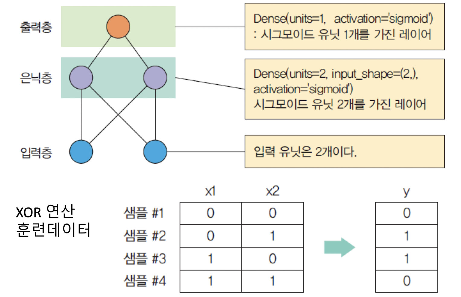 model.add(tf.keras.layers.Dense(units=2, input_shape=(2,), activation='sigmoid')) # ์ฒซ ๋ฒ์งธ ์๋์ธต, 2๊ฐ์ ์ ๋