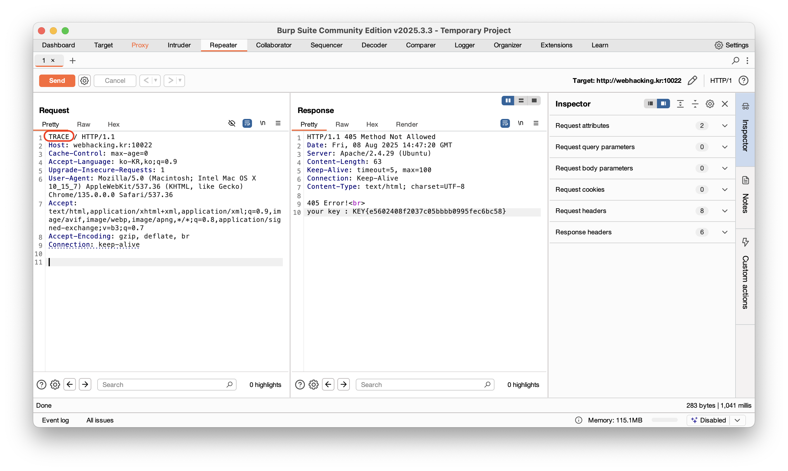 http 요청 메서드 중 하나인 TRACE로 바꿔서 보내니 역시 막혀있어서 405로 날라왔다.