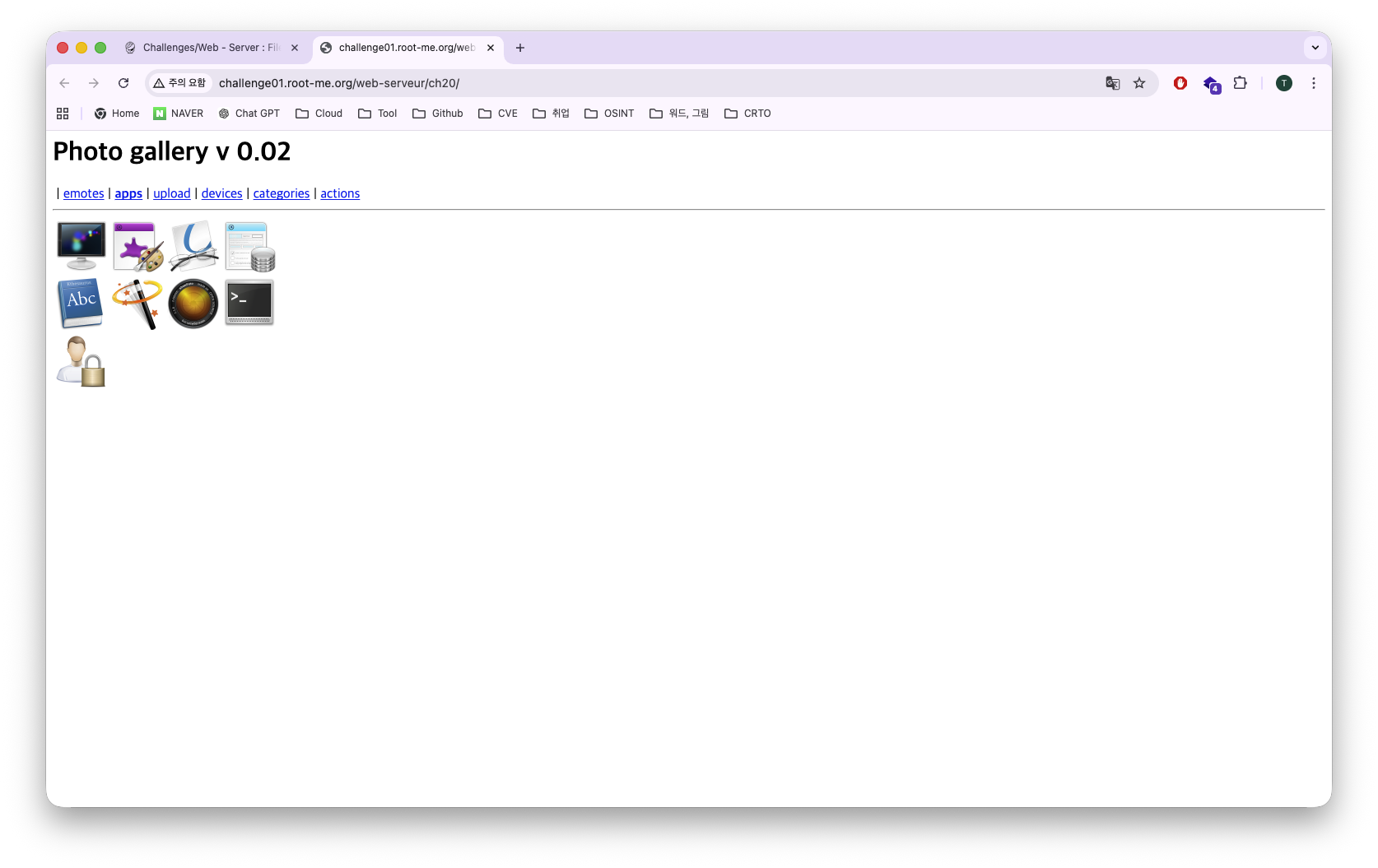 <html><body><h1>Photo gallery v 0.02</h1><span id="menu"/> | <span><a href='?galerie=emotes'>emotes</a></span> | <span><a href='?galerie=apps'><b>apps</b></a></span> | <span><a href='?galerie=upload'>upload</a></span> | <span><a href='?galerie=devices'>devices</a></span> | <span><a href='?galerie=categories'>categories</a></span> | <span><a href='?galerie=actions'>actions</a></span><br><hr><table id="content"><tr><td><a href='galerie/apps/preferences-desktop-screensaver.png'><img width=64px height=64px src='galerie/apps/preferences-desktop-screensaver.png?preview' alt='preferences-desktop-screensaver.png'></a></td><td><a href='galerie/apps/krita.png'><img width=64px height=64px src='galerie/apps/krita.png?preview' alt='krita.png'></a></td><td><a href='galerie/apps/graphics-viewer-document.png'><img width=64px height=64px src='galerie/apps/graphics-viewer-document.png?preview' alt='graphics-viewer-document.png'></a></td><td><a href='galerie/apps/kexi.png'><img width=64px height=64px src='galerie/apps/kexi.png?preview' alt='kexi.png'></a></td></tr><tr></tr><tr><td><a href='galerie/apps/kthesaurus.png'><img width=64px height=64px src='galerie/apps/kthesaurus.png?preview' alt='kthesaurus.png'></a></td><td><a href='galerie/apps/plasmagik.png'><img width=64px height=64px src='galerie/apps/plasmagik.png?preview' alt='plasmagik.png'></a></td><td><a href='galerie/apps/showfoto.png'><img width=64px height=64px src='galerie/apps/showfoto.png?preview' alt='showfoto.png'></a></td><td><a href='galerie/apps/utilities-terminal.png'><img width=64px height=64px src='galerie/apps/utilities-terminal.png?preview' alt='utilities-terminal.png'></a></td></tr><tr></tr><tr><td><a href='galerie/apps/preferences-desktop-user-password.png'><img width=64px height=64px src='galerie/apps/preferences-desktop-user-password.png?preview' alt='preferences-desktop-user-password.png'></a></td></tr></table></body></html>