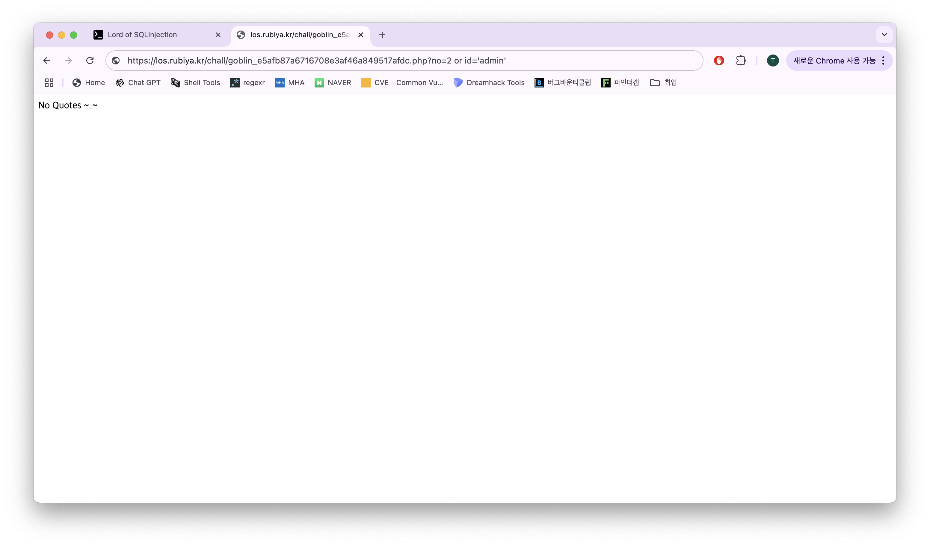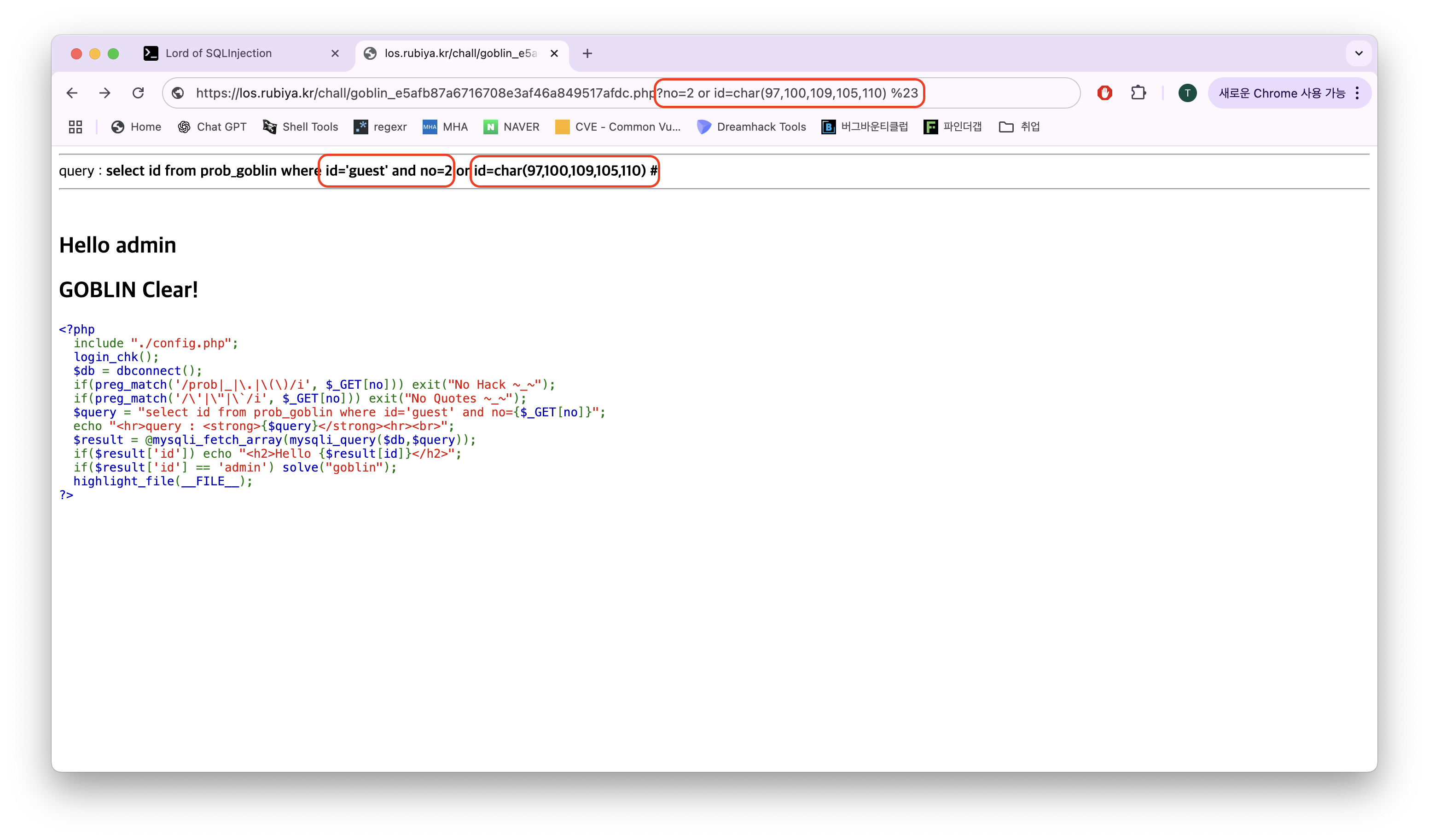 CHAR() 함수로 ASCII코드를 받으면 입력이 들어갈때 'admin'으로 들어가기 때문에 싱글쿼터, 더블쿼터를 신경 안써도 된다.
