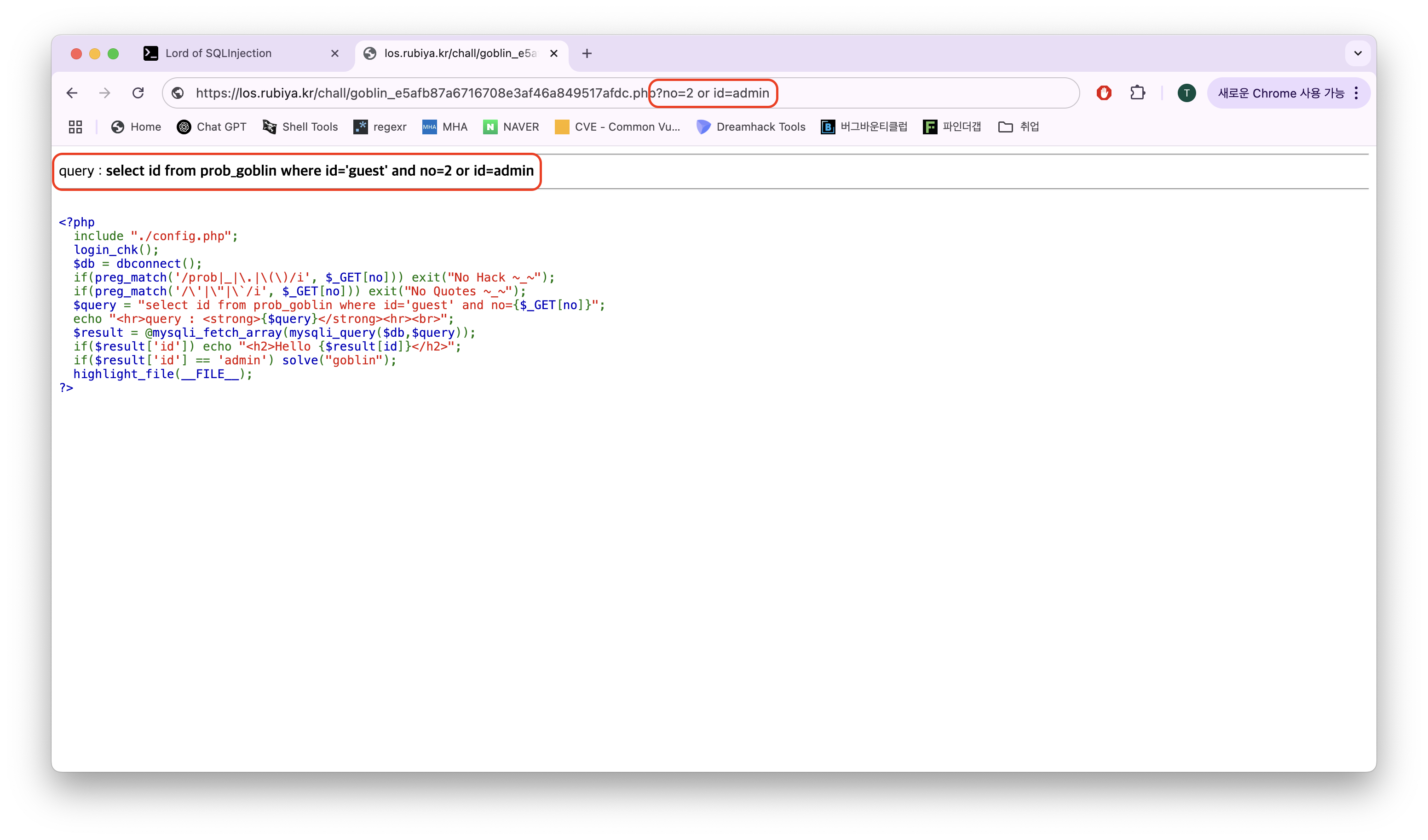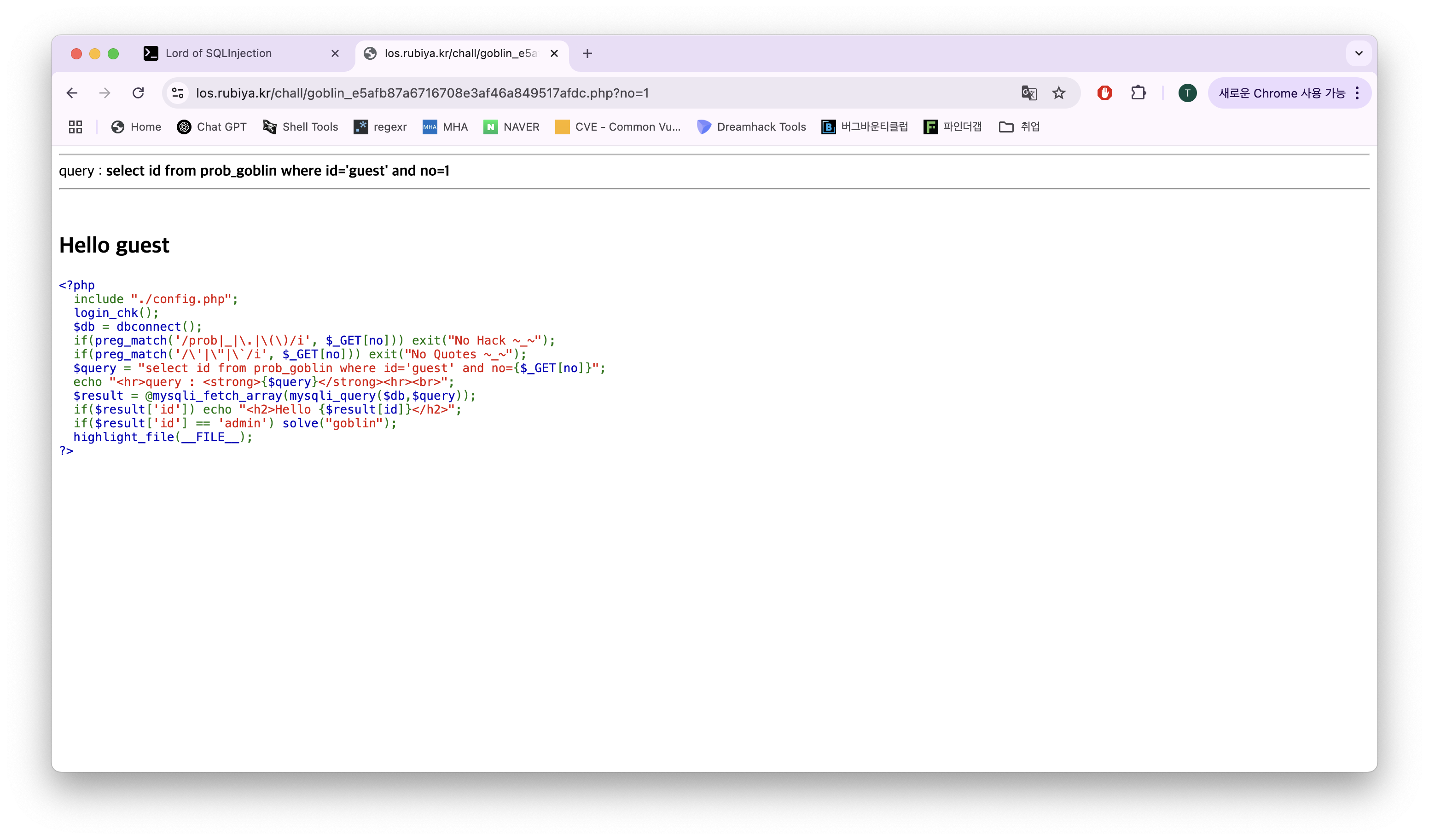 $query = "select id from prob_goblin where id='guest' and no={$_GET[no]}";