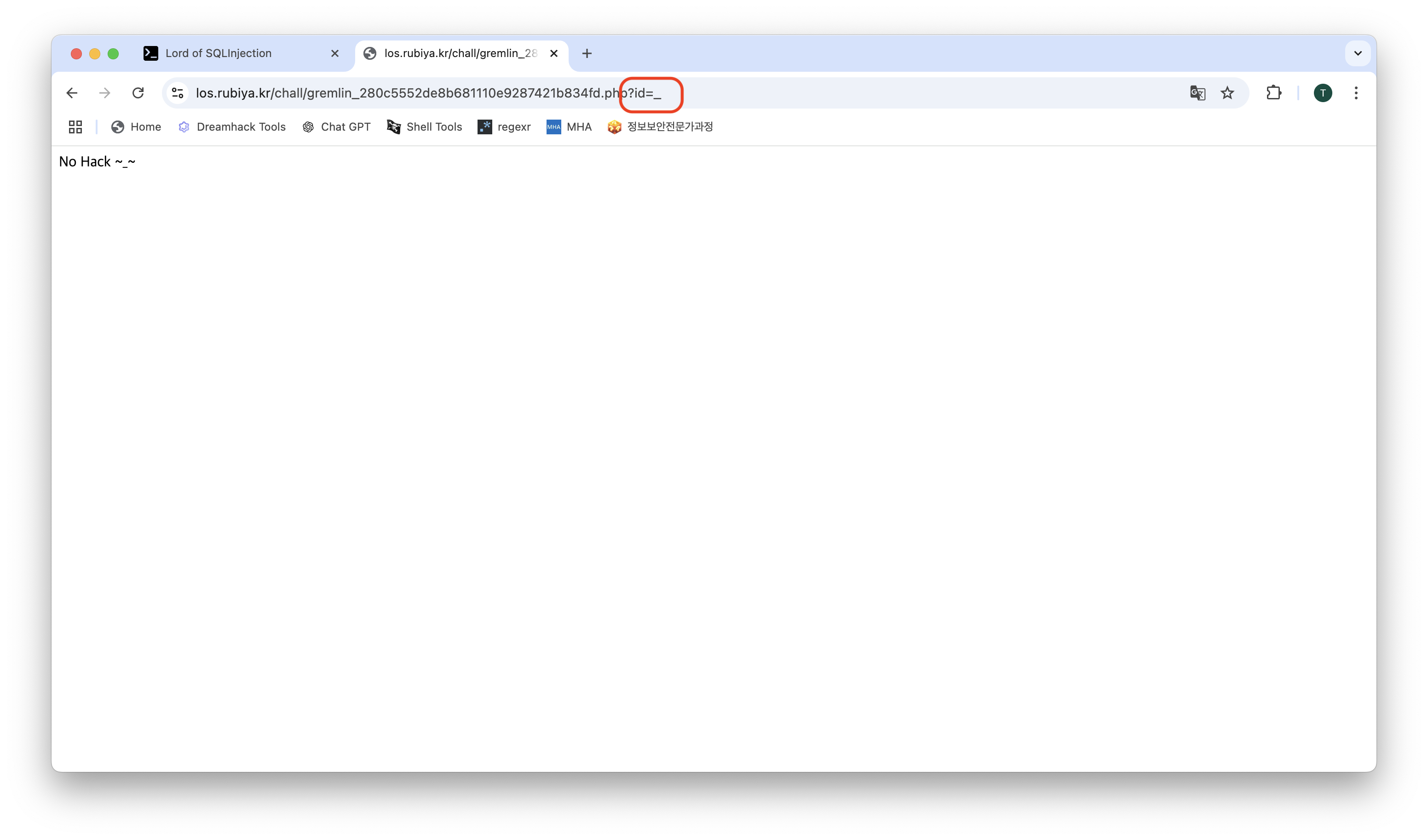preg_match 함수를 통해 특정 문자열을 삽입하면 No Hack 이라고 친절하게 알려준다.