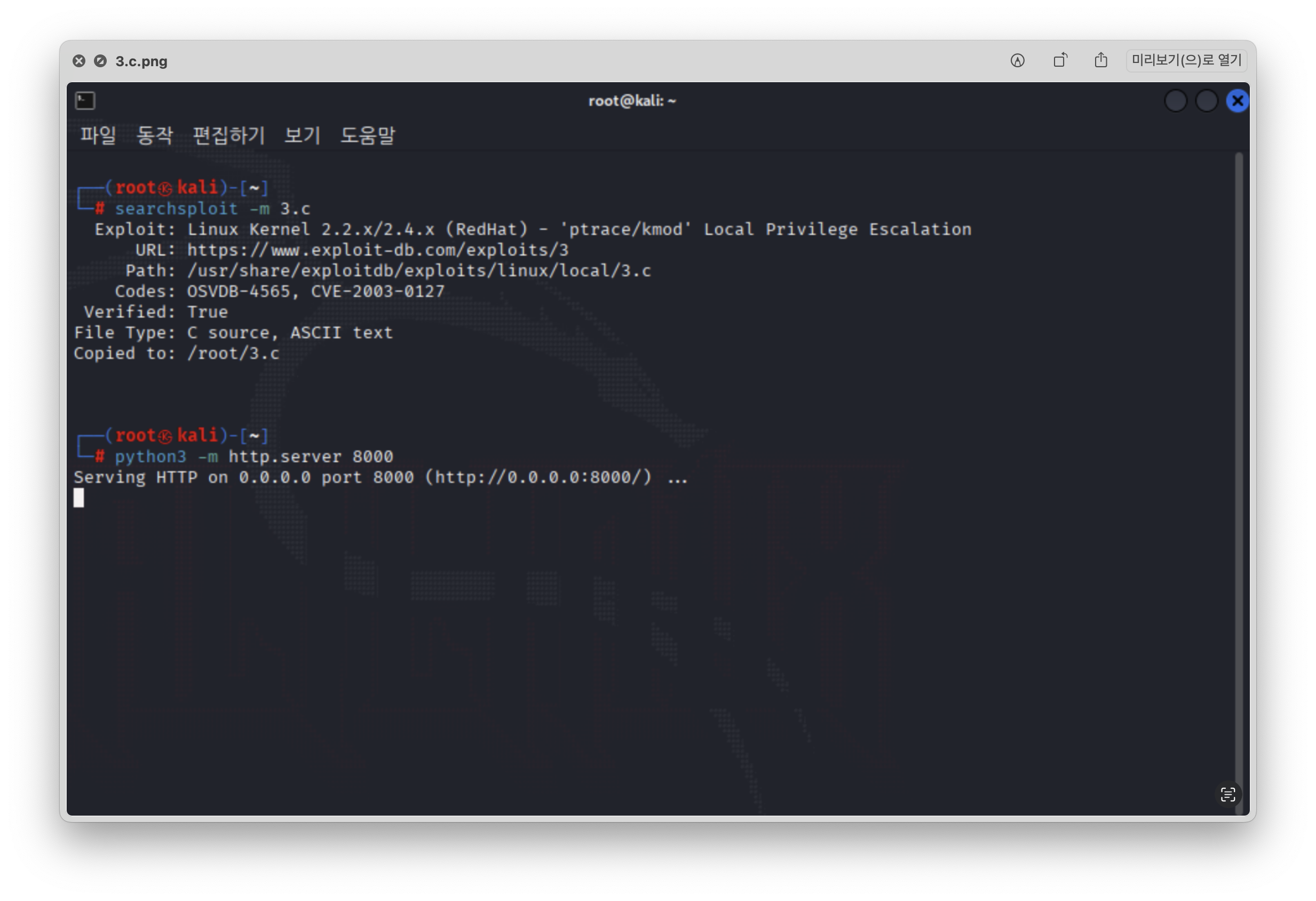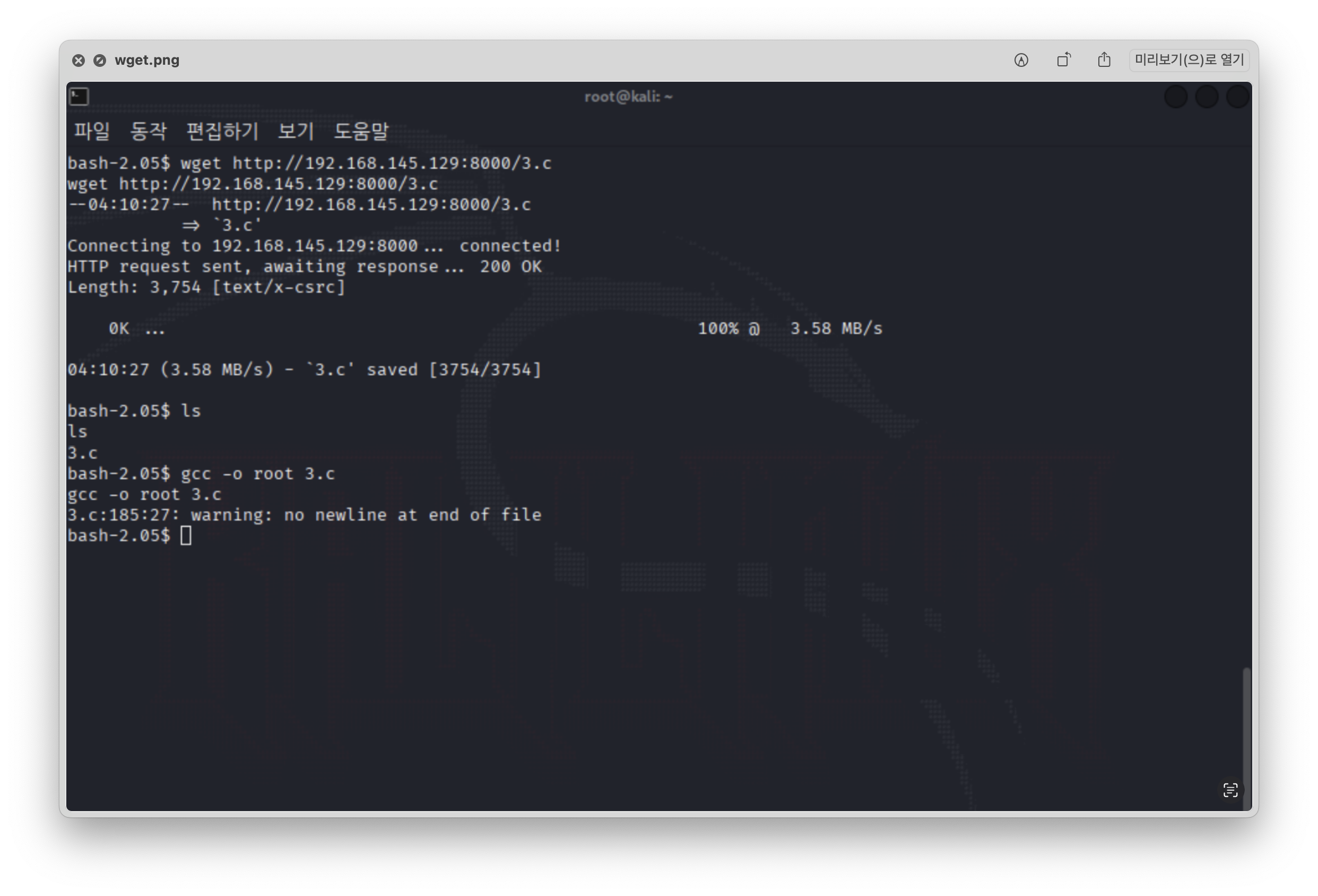 이후 가져온 3.c 파일과 같은 디렉토리에서 http 서버를 열어줬고 이거를 타켓서버에서 다운받을거다.