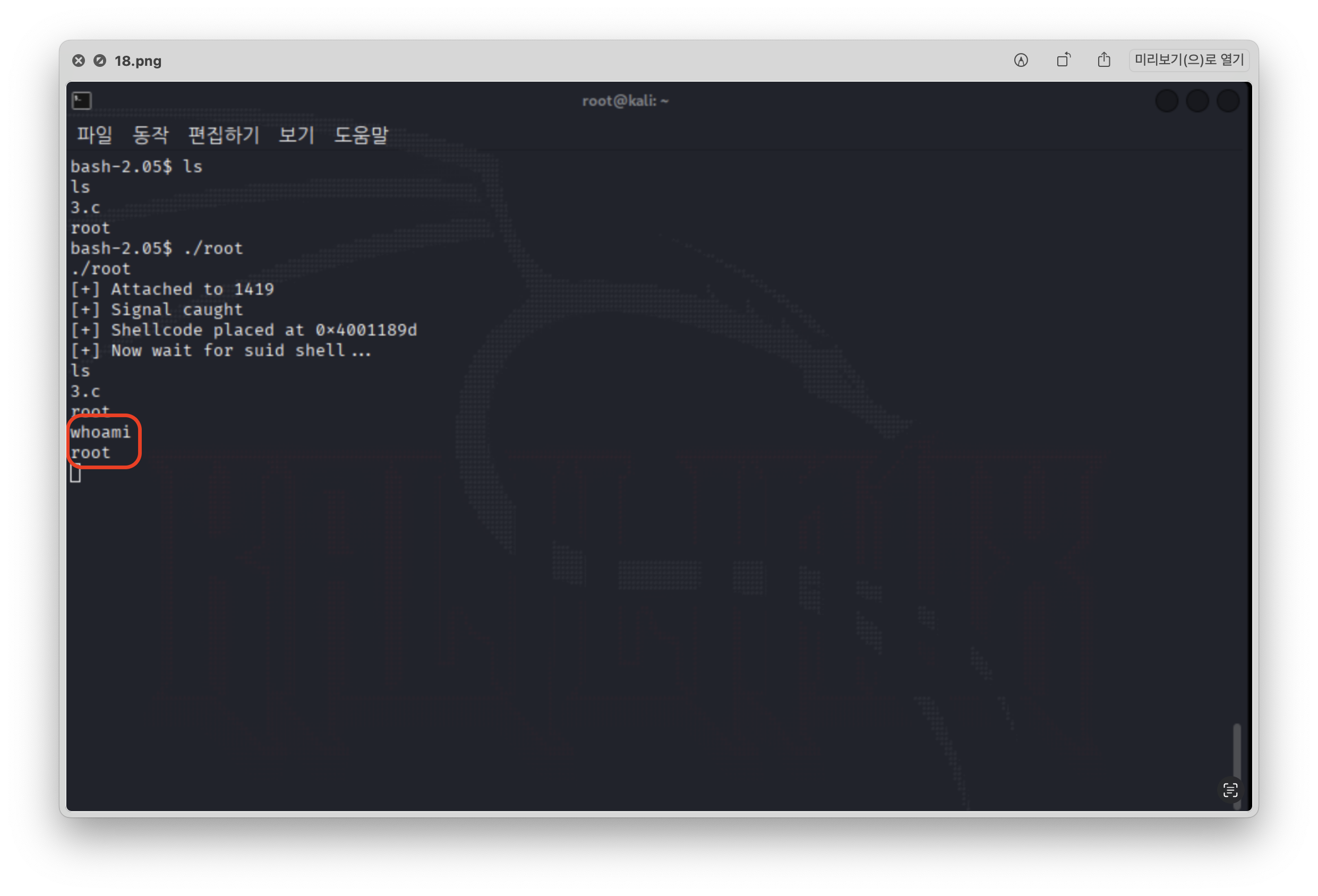 저기서 whoami 명령어를 입력해주면 root로 권한상승 된것을 확인이 가능하고 passwd를 통해 비밀번호를 바꿔주고