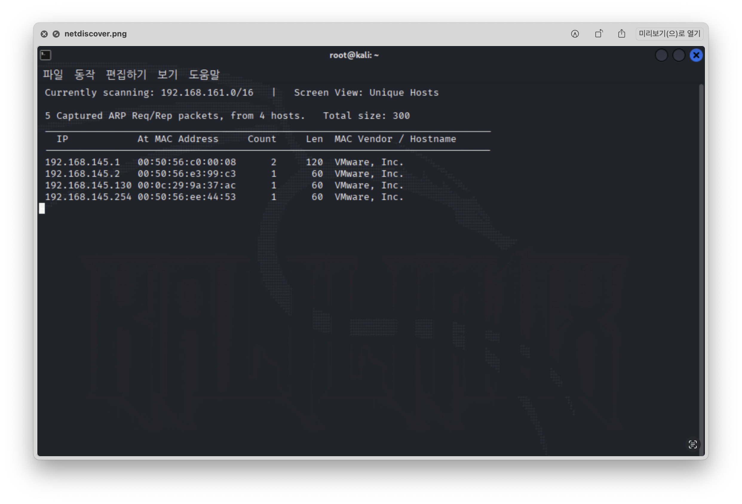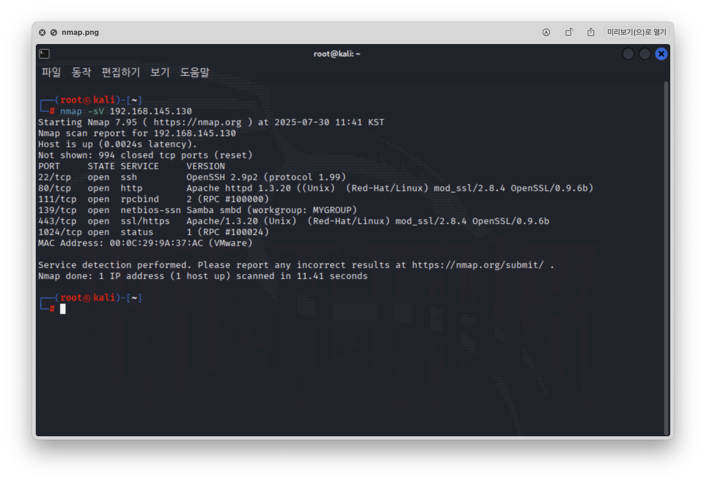 확인한 IP를 가지고 nmap을 이용해 어떤 포트가 사용중인지 확인 했고