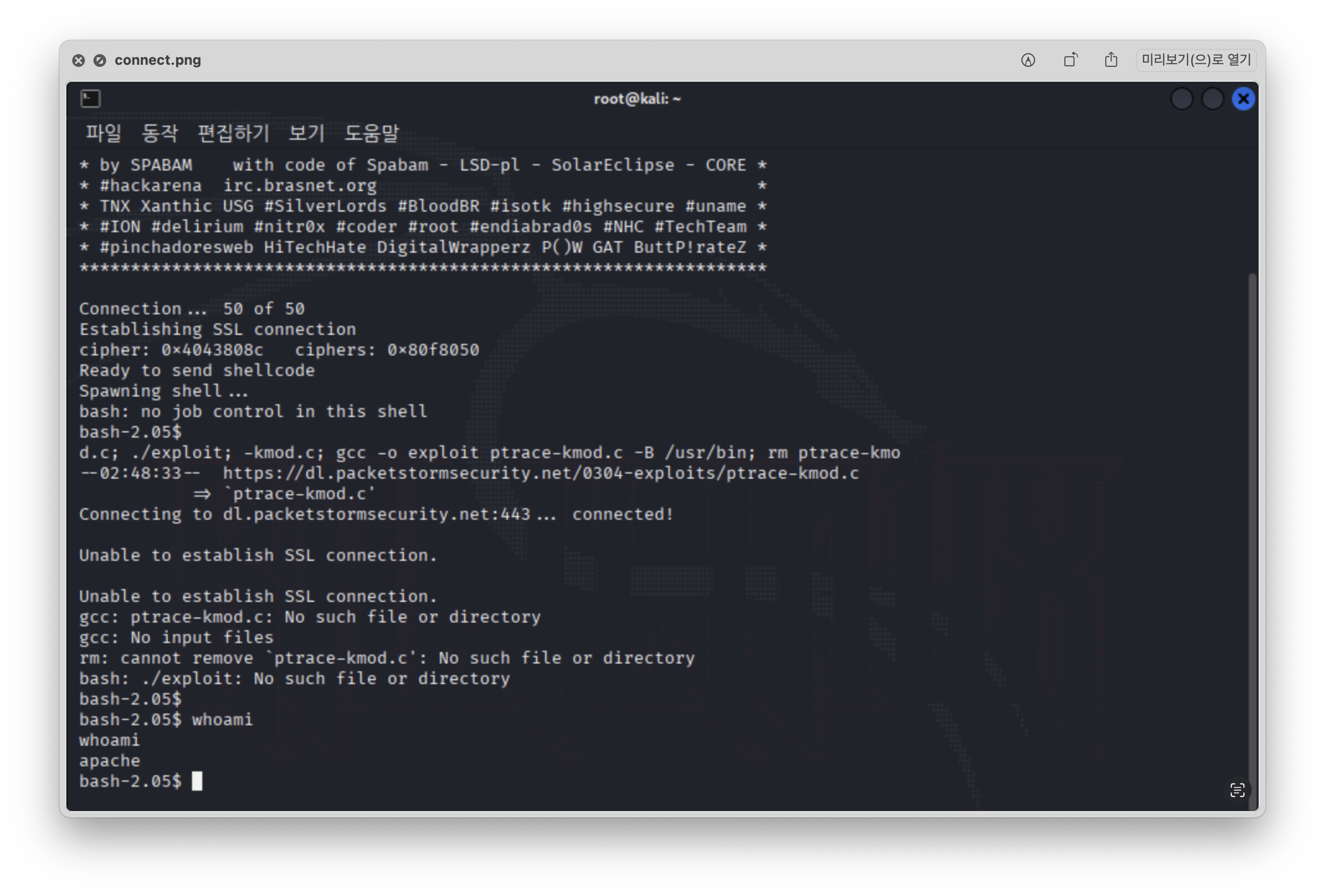 접속이 잘 되었고 바로 whoami를 입력하니 apache로 쉘에 접속한 것이다.