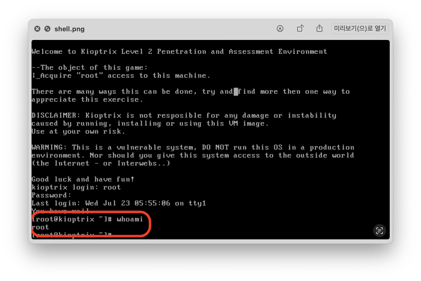 ./root 를 입력하니 뭐라 나오는데 무시하고 whoami를 다시 해보니