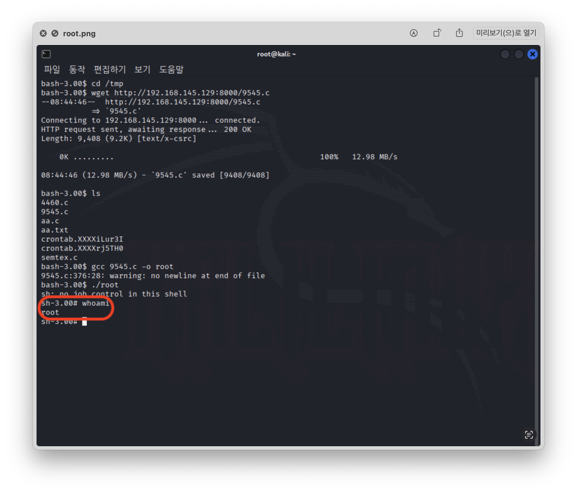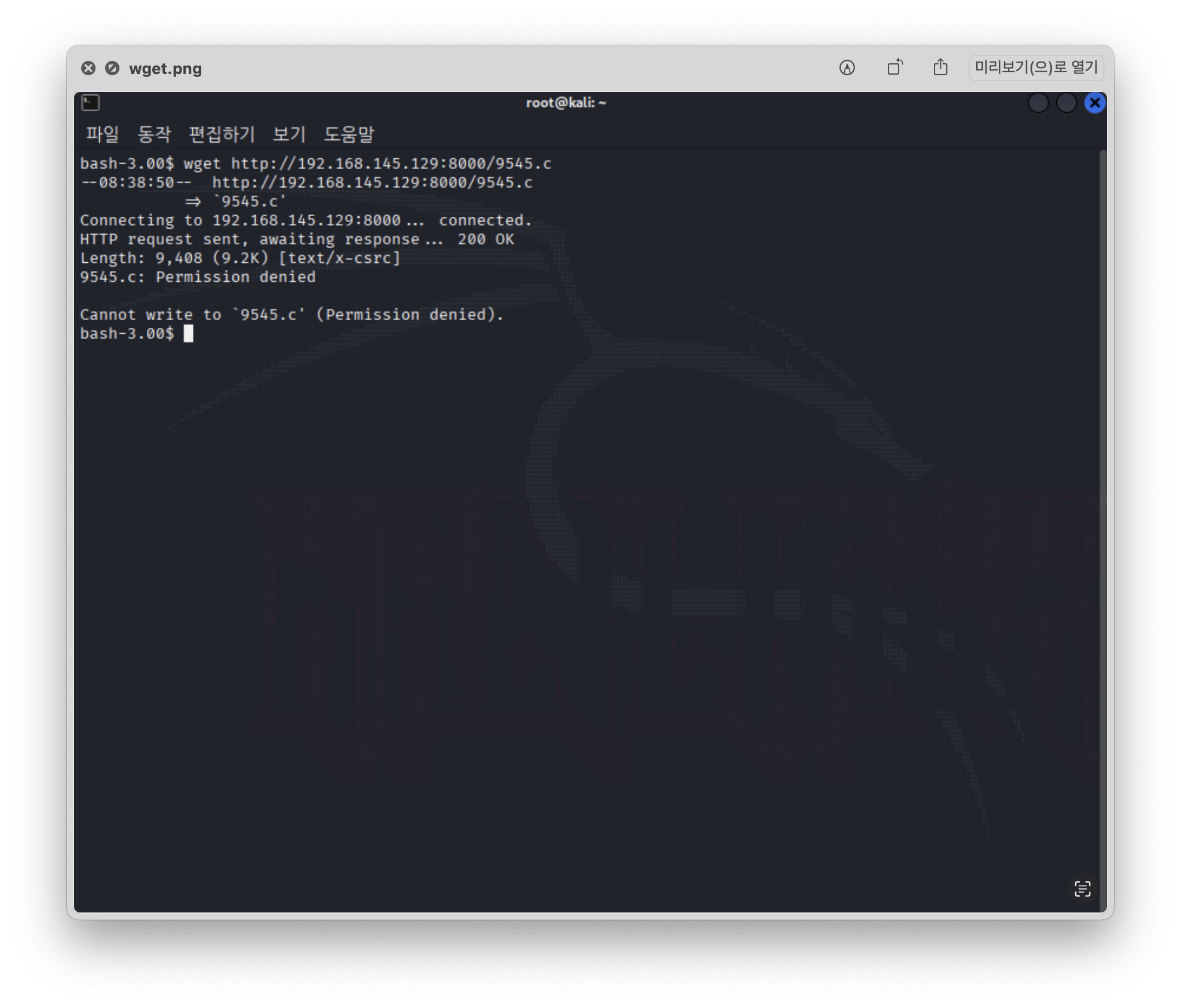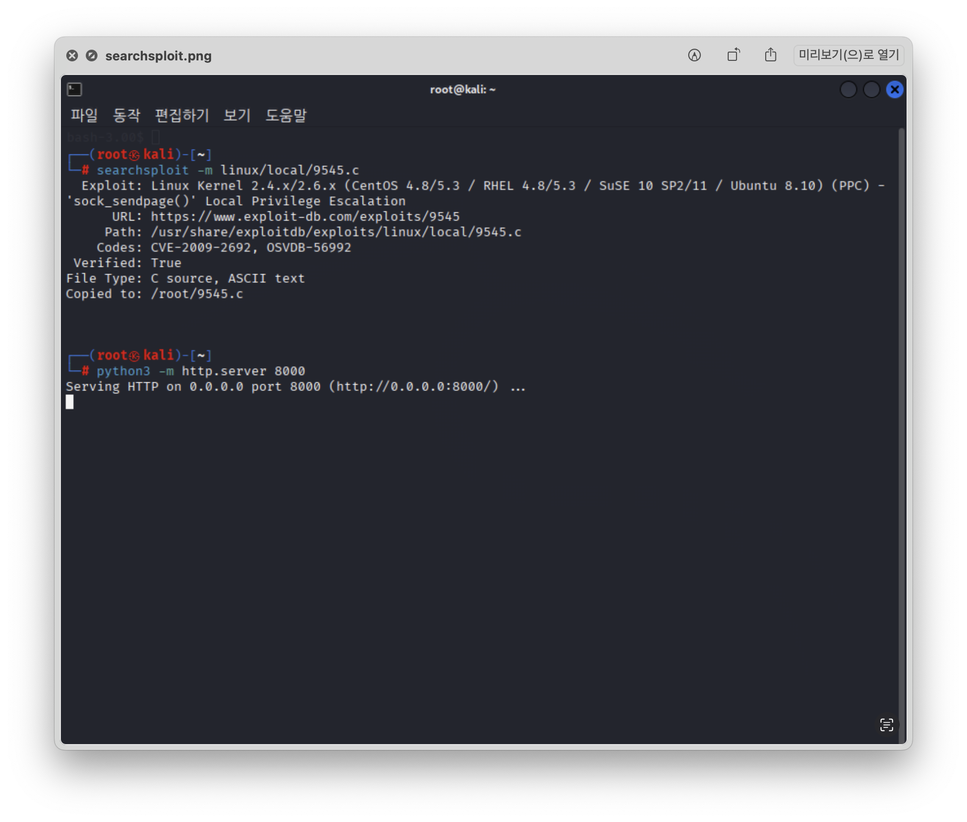 EDB-ID가 9545인것을 확인하였고, Kali 다른 터미널에서 명령어를 통해 다운받았다.