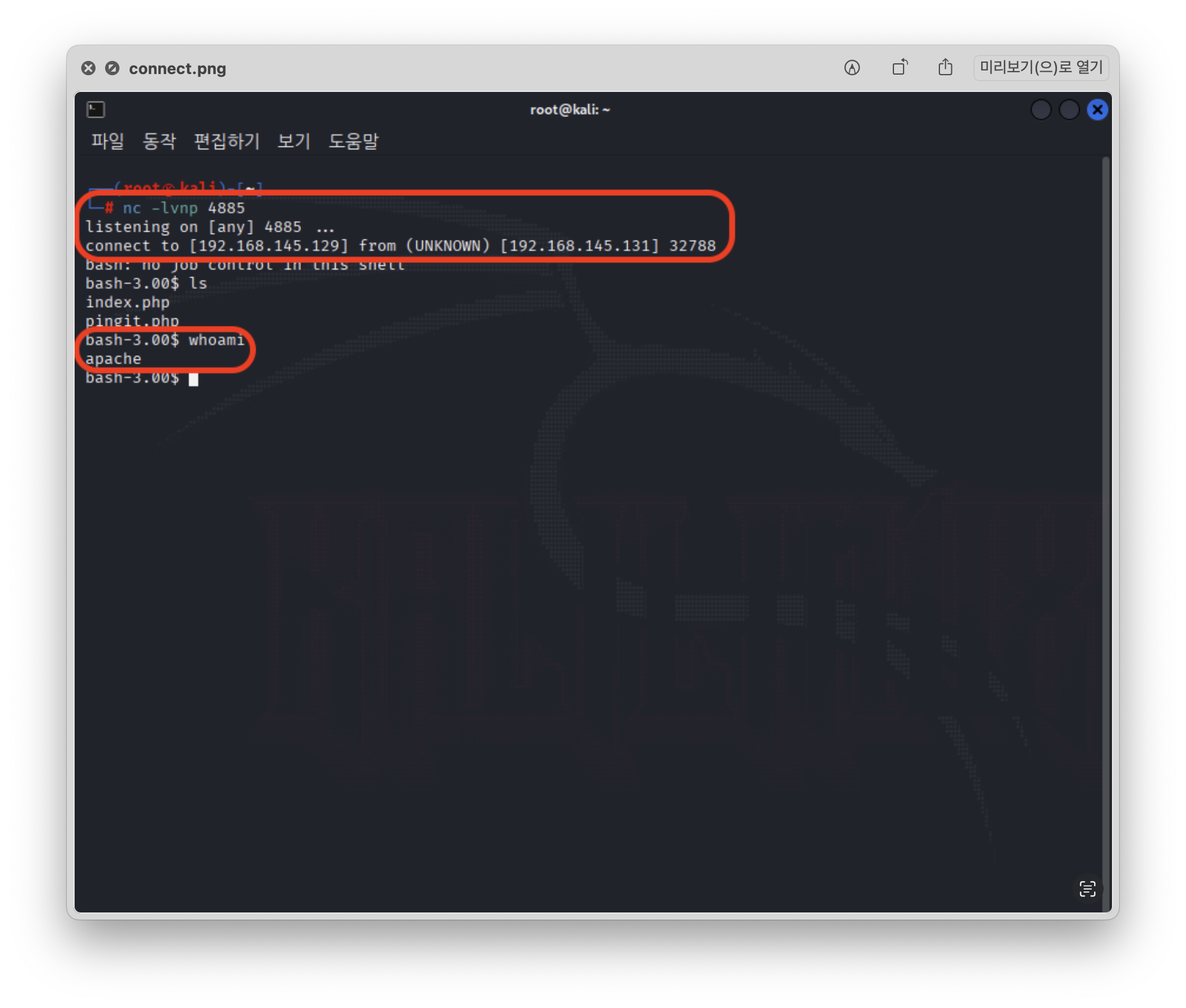 Command Injection이 가능한 란에 코드를 삽입하고 나한테 연결을 시도하였더니