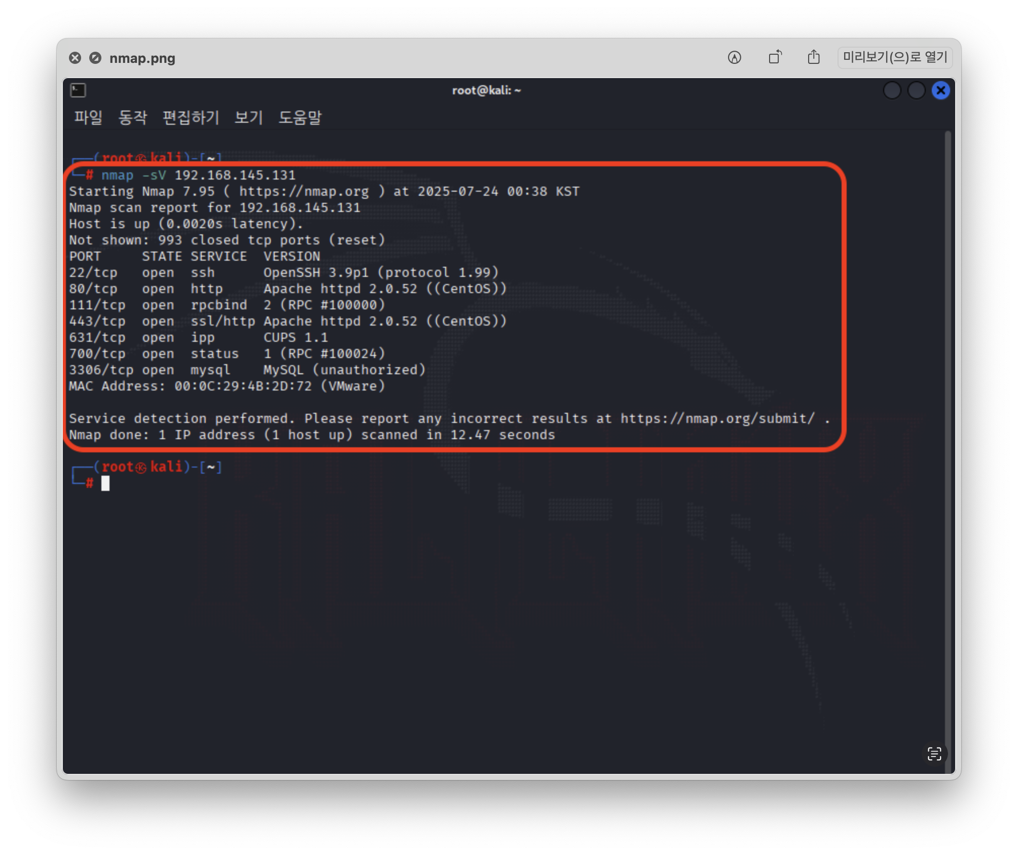 해당 가상환경의 IP를 확인하고 바로 포트스캔을 때려보았다.