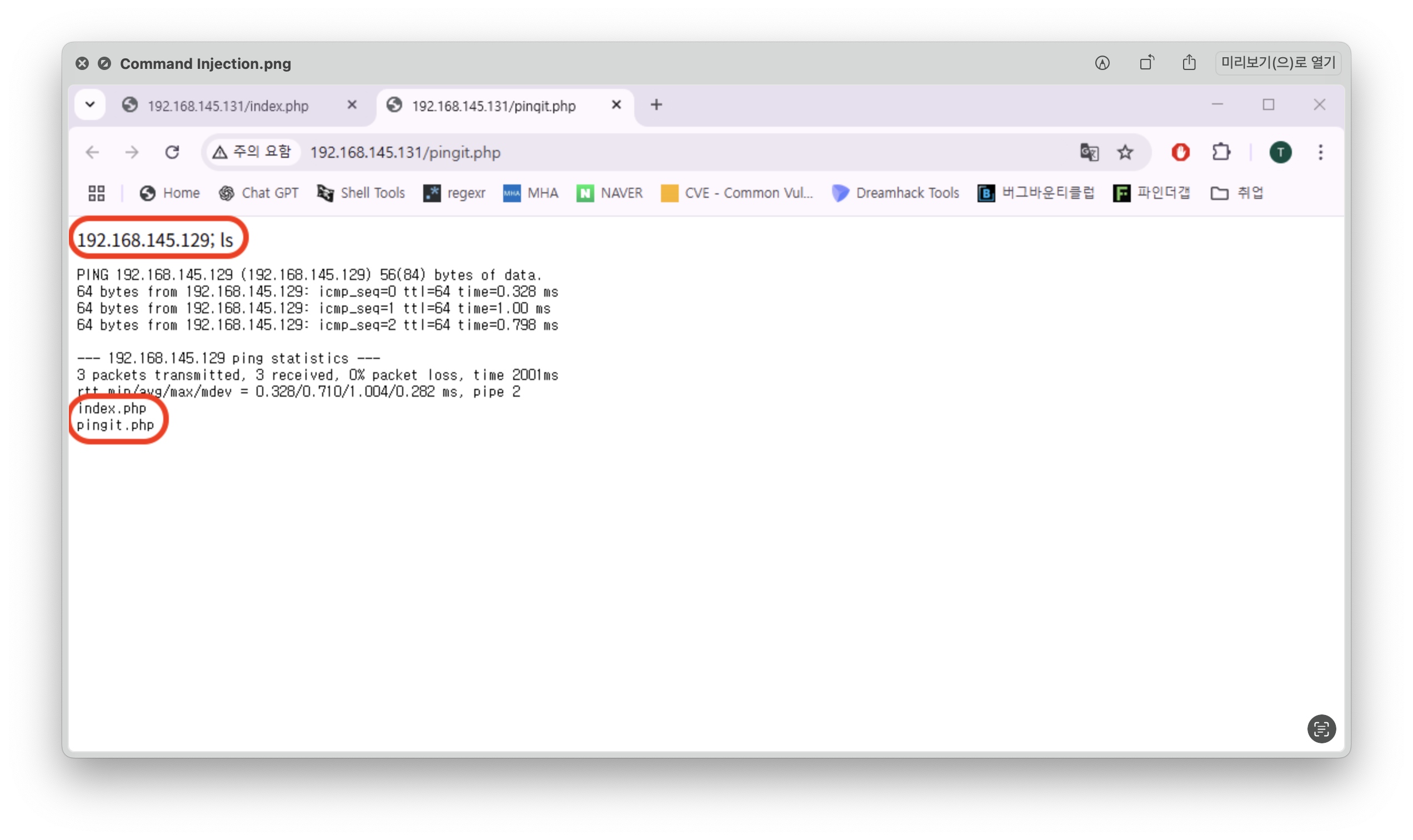 가장 기본적인 세미콜론(;)을 삽입하여 앞에 명령을 처리하고 뒤에 명령도 처리하는 즉 and 형식으로 192.168.149.129; ls를 삽입하였더니