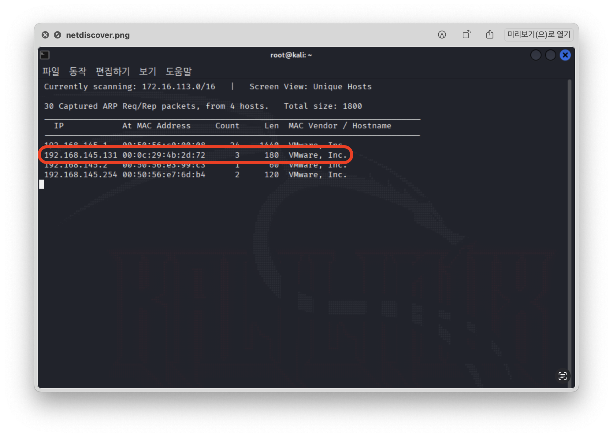 내가 사용중인 Kali 터미널에서 netcat 명령어로 네트워크 연결을 대기상태로 두고