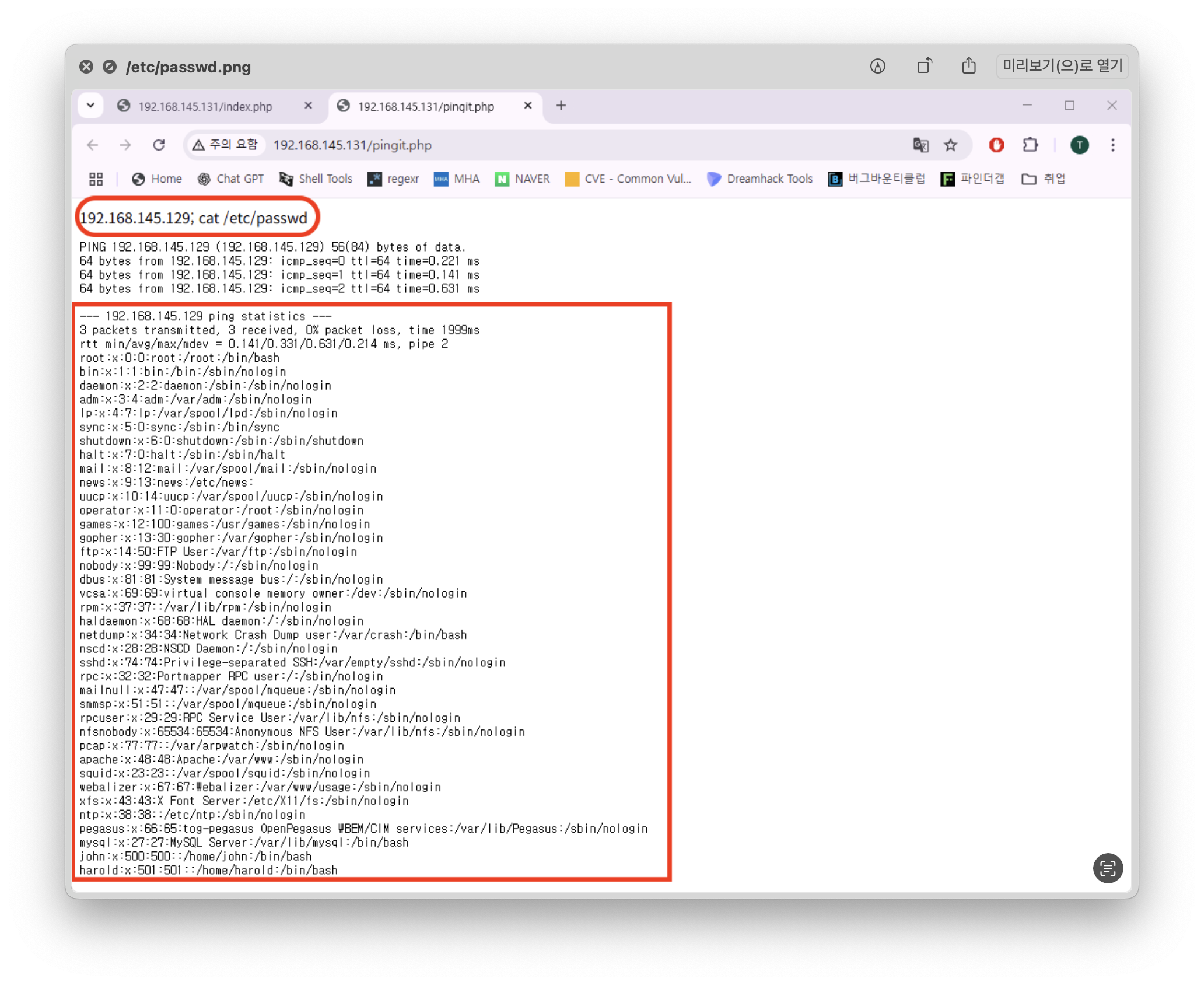 즉 Command Injection이 되는 구조이고 명령어가 먹힌다면 나는 가장 먼저 해보는것이 /etc/passwd, /etc/shadow 및 whoami 이 세 가지를 필수적으로 한다.
