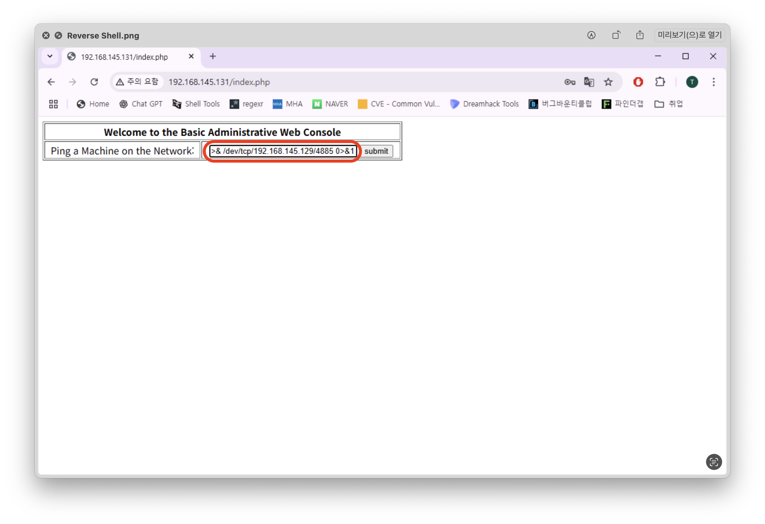 이후 여러가지 맨땅에 헤딩을 하다 Reverse Shell로 연결을 시도하였다.