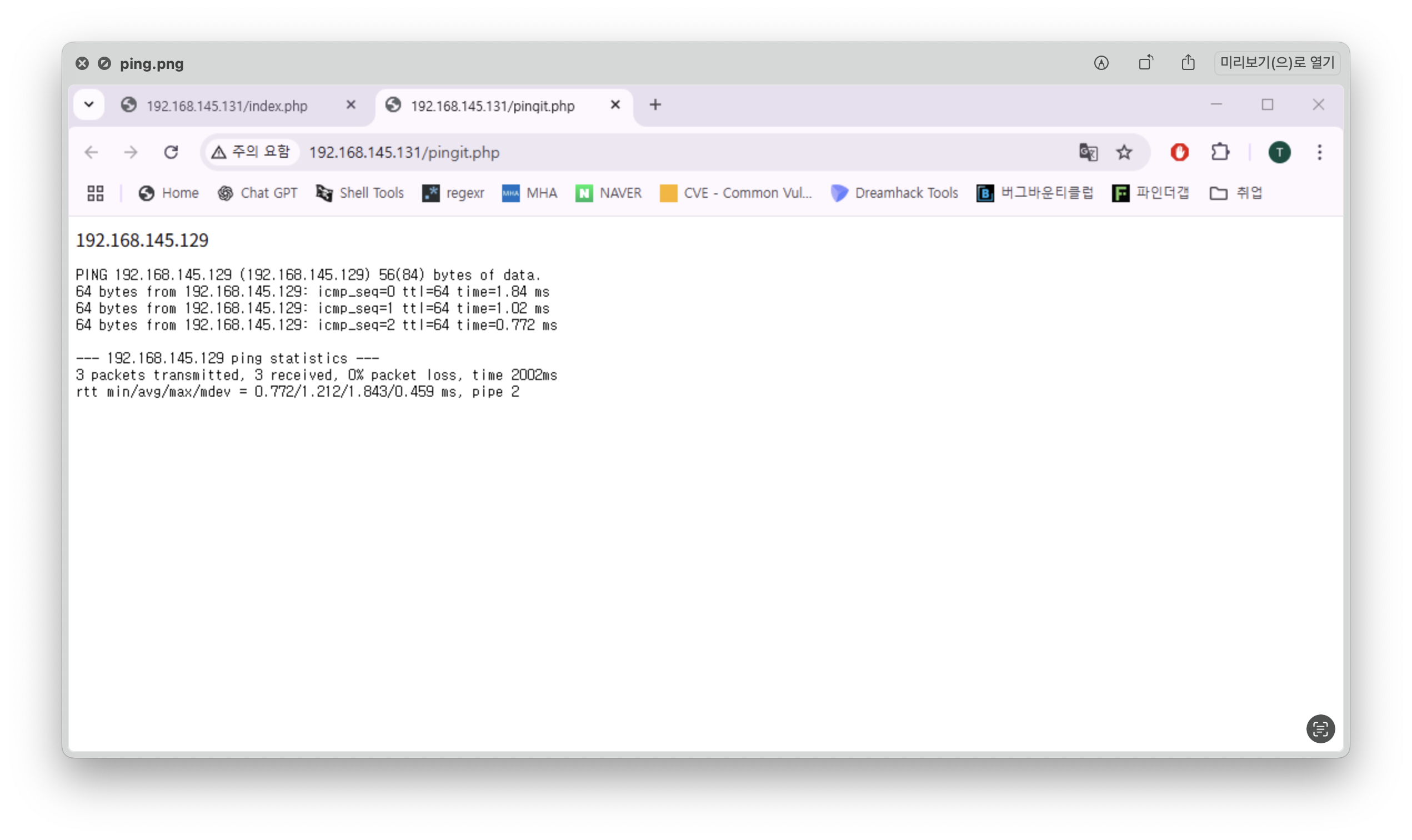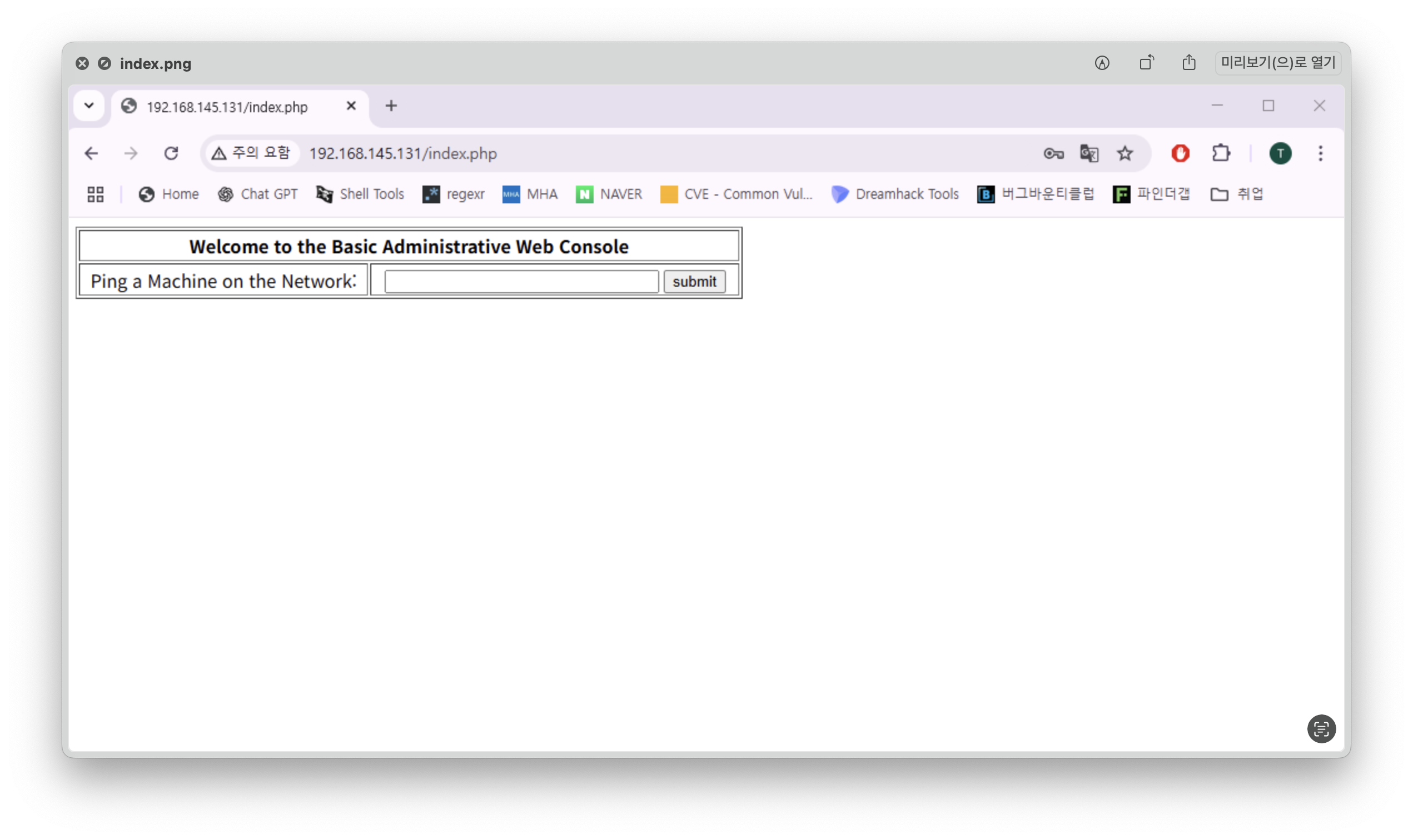 핑을 보낼수 있다는 것은 ping [입력란] 이런 구조이므로 어떤 형식으로 되어 있는지는 잘 모르겠지만, Command Injection을 노려봐야 한다.