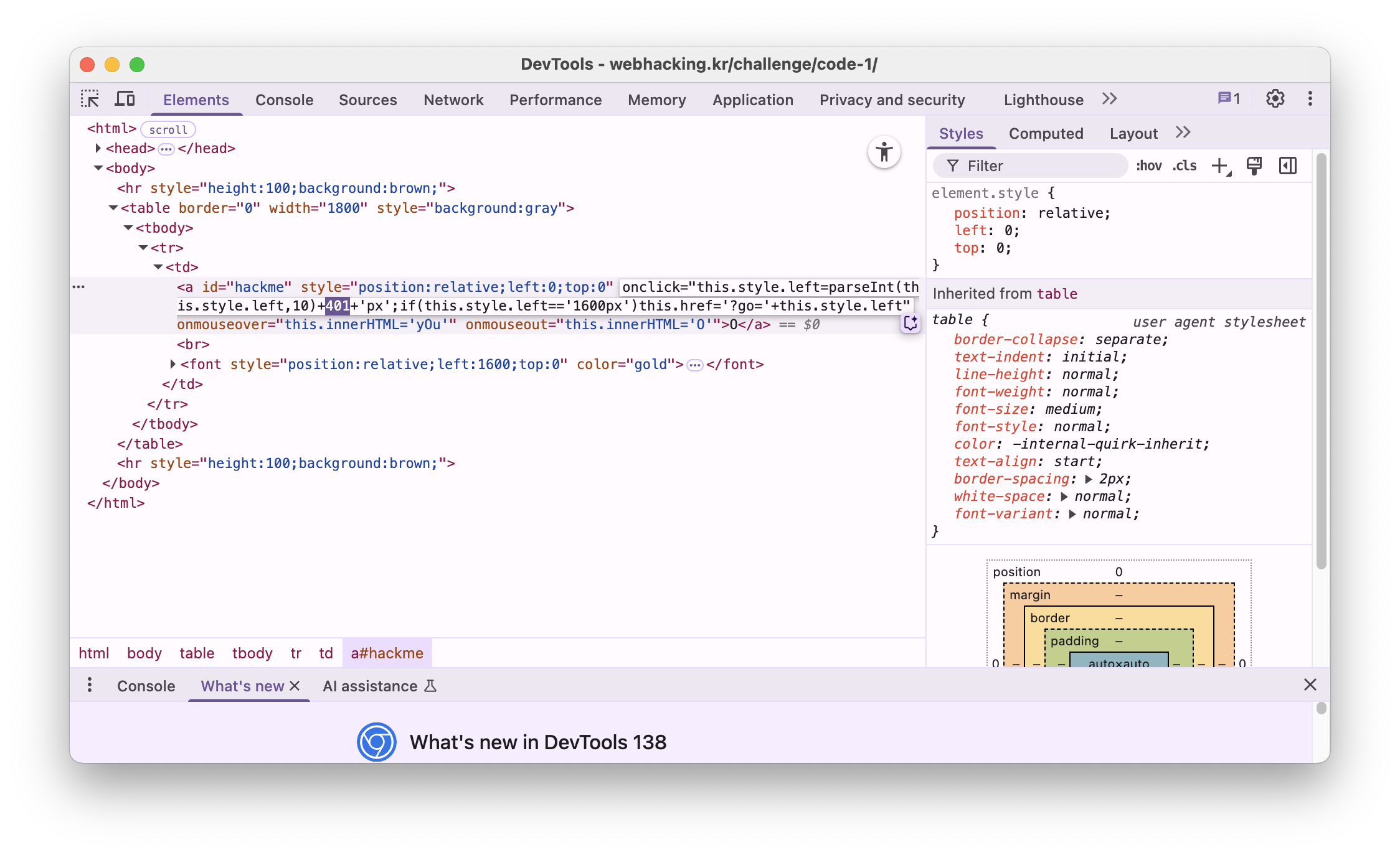 <a id="hackme" style="position:relative;left:0;top:0" onclick="this.style.left=parseInt(this.style.left,10)+1+'px';if(this.style.left=='1600px')this.href='?go='+this.style.left" onmouseover="this.innerHTML='yOu'" onmouseout="this.innerHTML='O'">O</a>