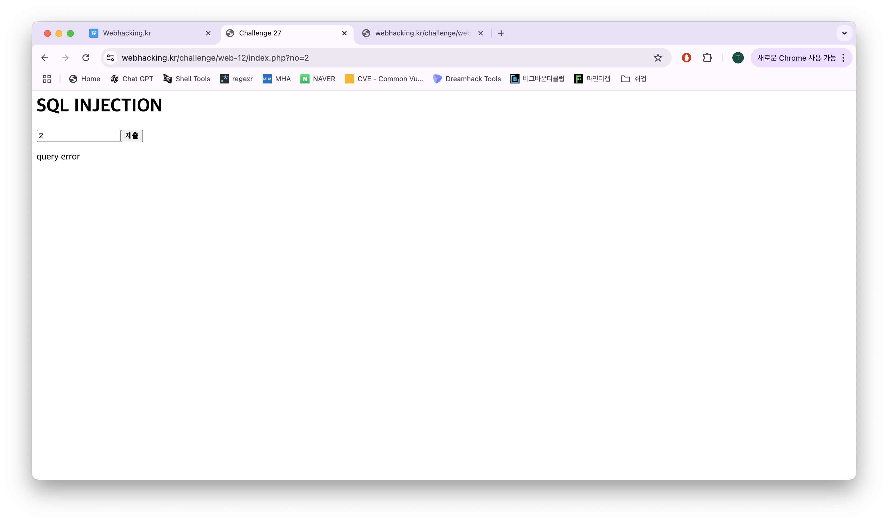 아무래도 해당 코드 때문에 id = 'guest' / no = 1 이 나오지 않으면 무조건 "query error" 문구를 나오게 하는 것 같다.