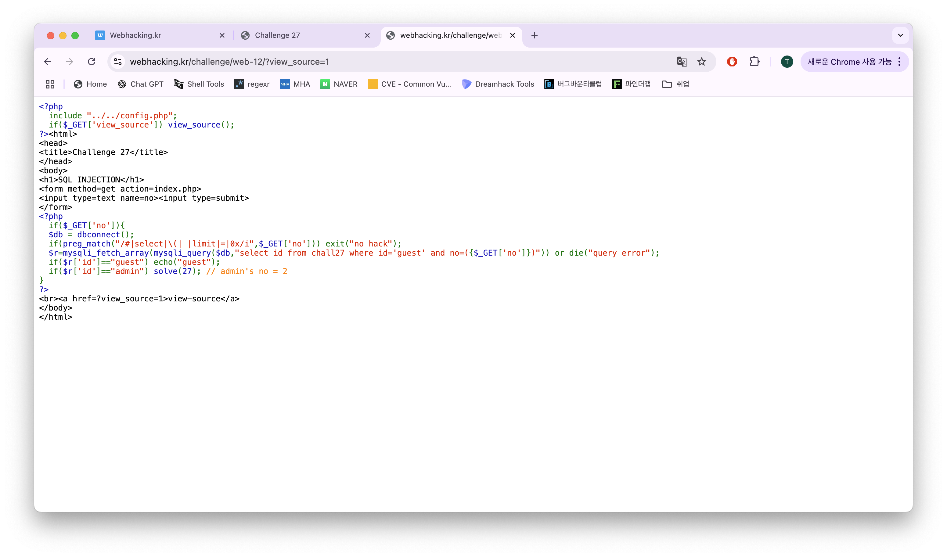 if($r['id']=="admin") solve(27); // admin's no = 2